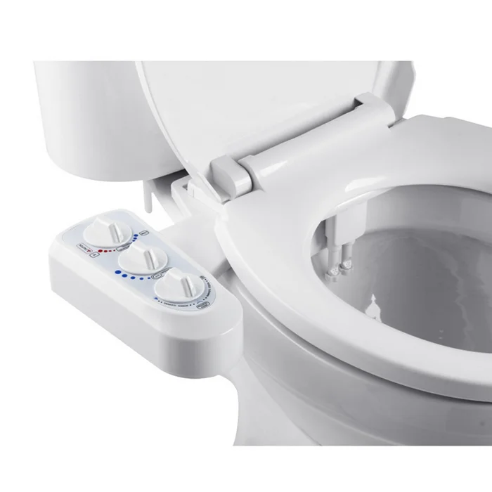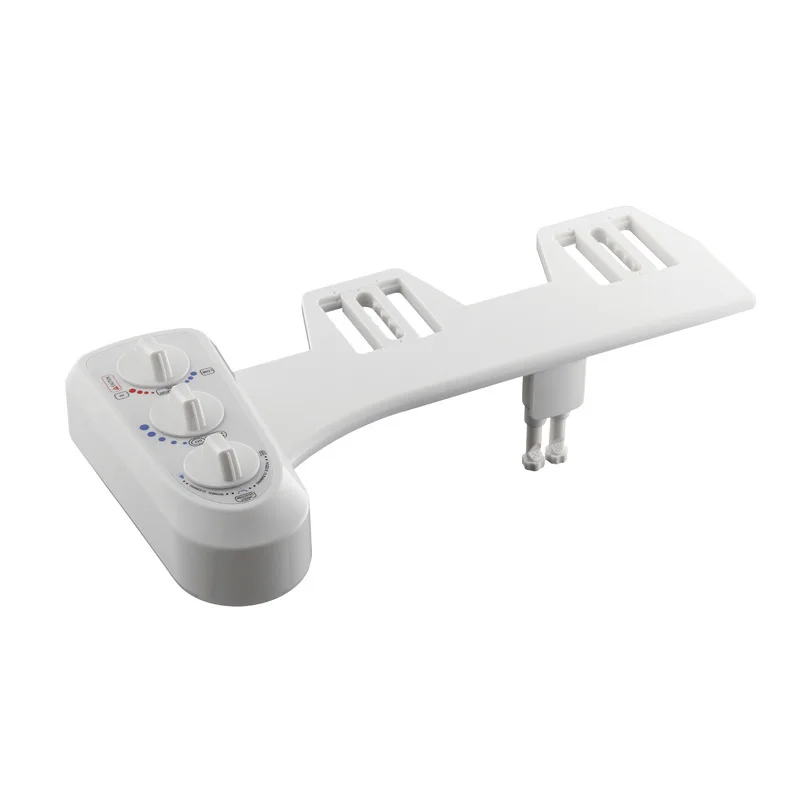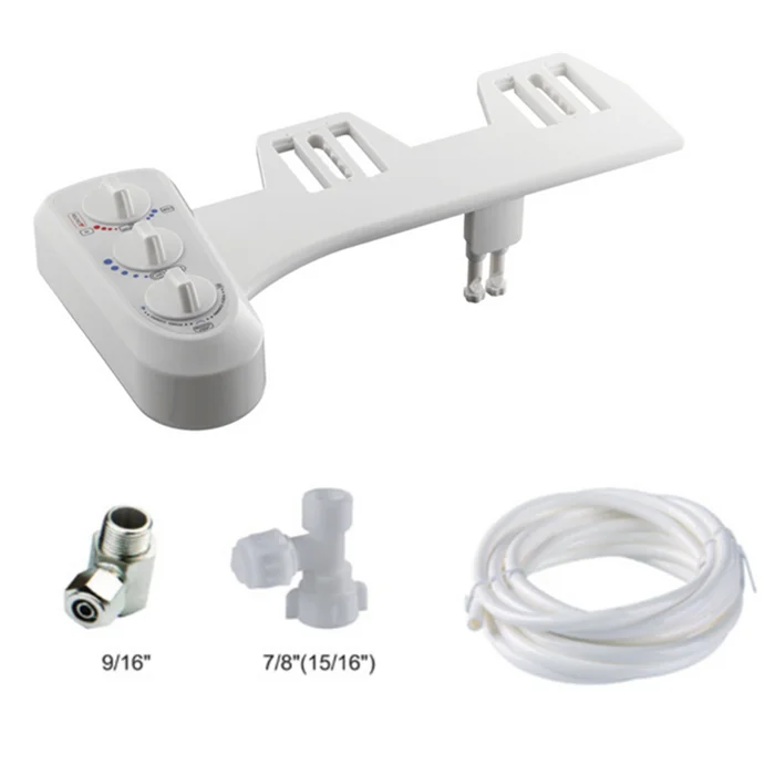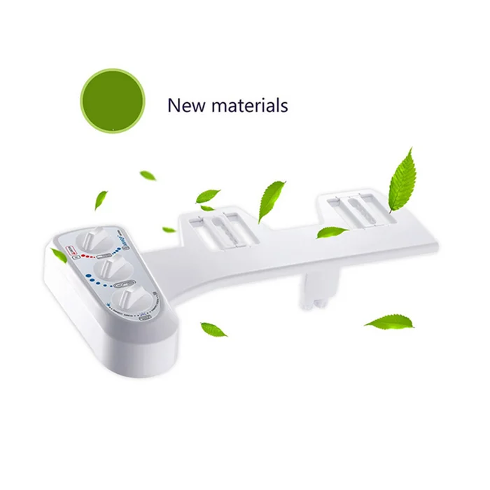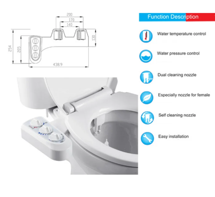 Bidet Features: 1. A convenient and fresh solution for daily hygienic cleaning. 2. Attaches in 10 minutes to an existing two piece round or elongated toilet seat. All needed accessories for instillation are included. 3. Dual nozzles, with the frontal nozzle providing ultimate sanitary feminine washing for monthly cycles. 4. Connects to hot and cold water, allowing for adjustable water temperature. 5. No electricity or batteries required. Completely safety and eco-friendly. 6. Made from easy-to-clean, anti-bacterial ABS material. 7. Self-cleaning & retractable nozzle for consistent cleanliness. 8. Equipped with 3 simple control dials. 9. Easy to use for children, adults and the elderly. | |