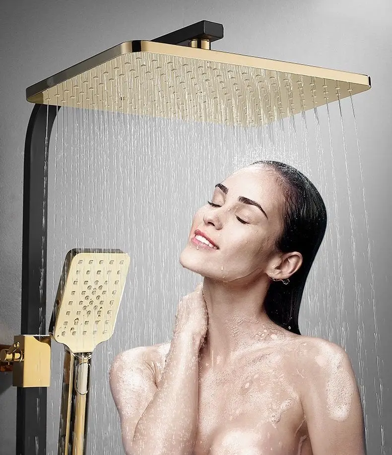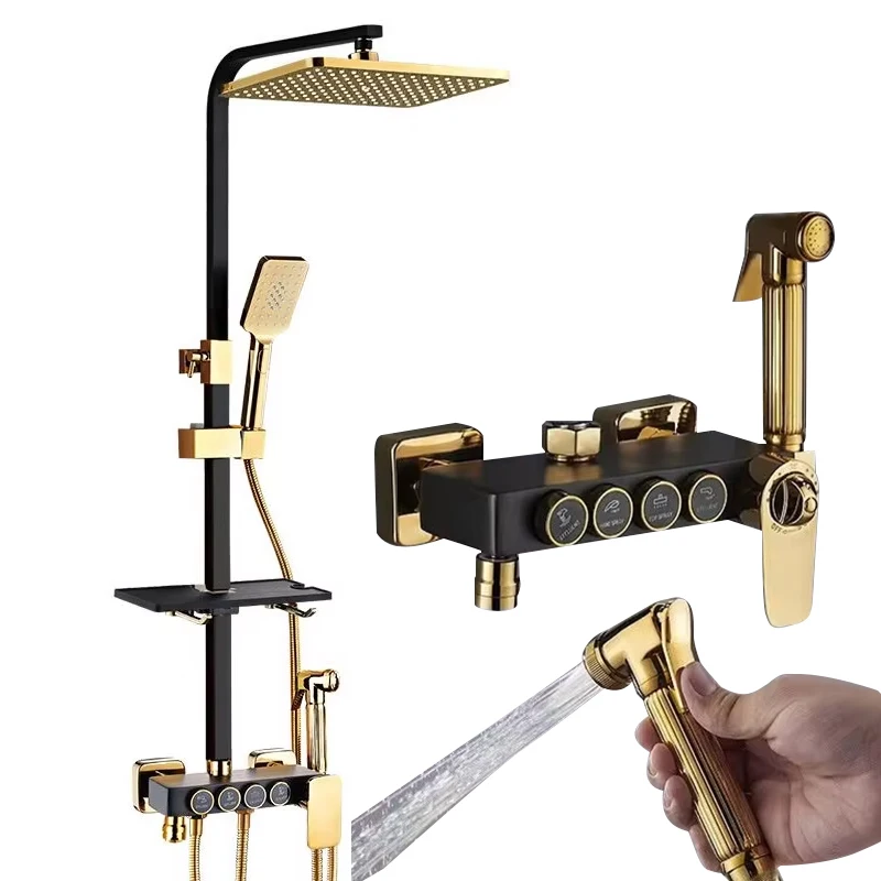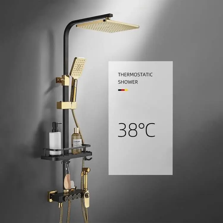 Luxury Black Gold Multi-Function Rainfall Thermostatic Shower Set with Hand Shower and Bidet Sprayer and Storage Shelf