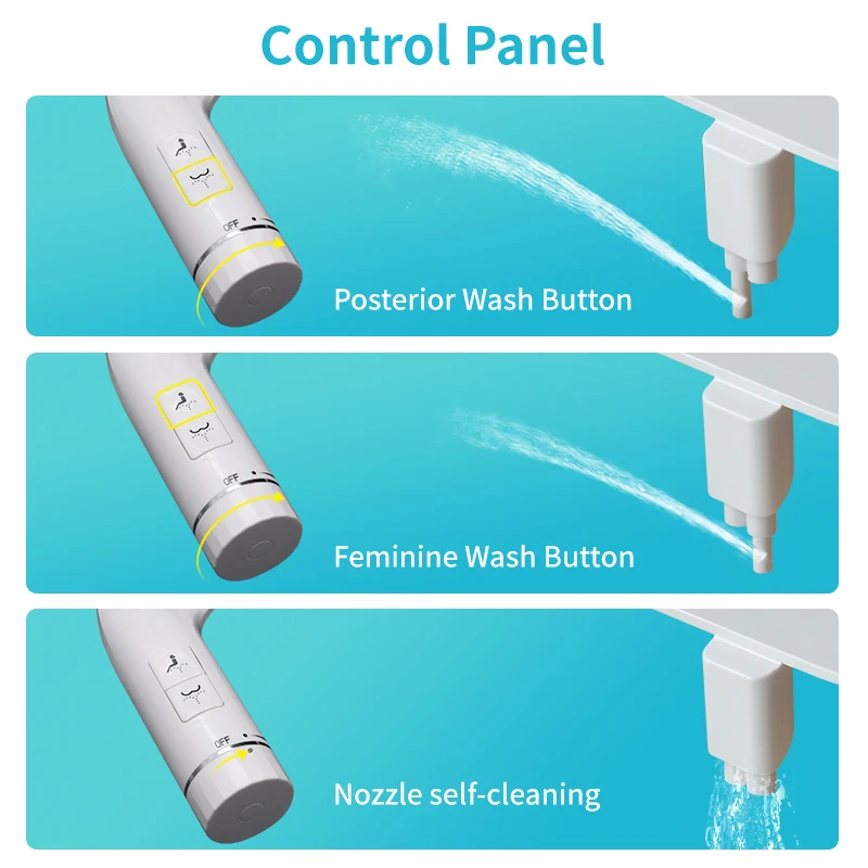 Features | 1. Soft body cleaning / Nozzle self-cleaning 2. Dual nozzles spray / Water pressure control 3. Backflow prevention device /Ultra-slim board (only 6mm) 4. Non-electric /Easy installation / Button & Knob control |