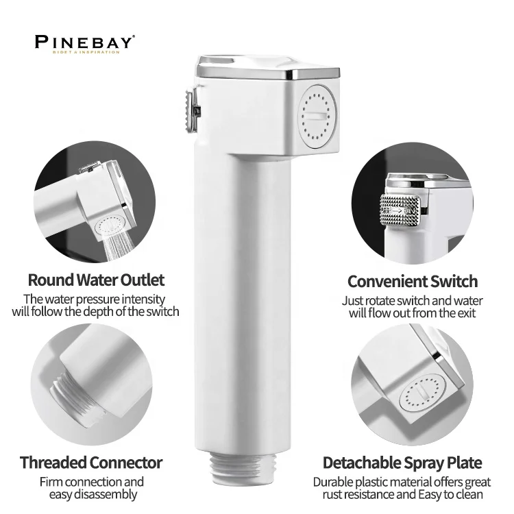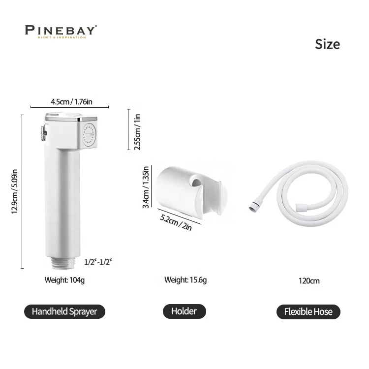 Component | 1*ABS Plastic handheld bidet sprayer head, white and chrome finsh 1*ABS Plastic holder, white finsh 1*120cm PVC bidet hose, anti-twist design, white finsh | ||||||