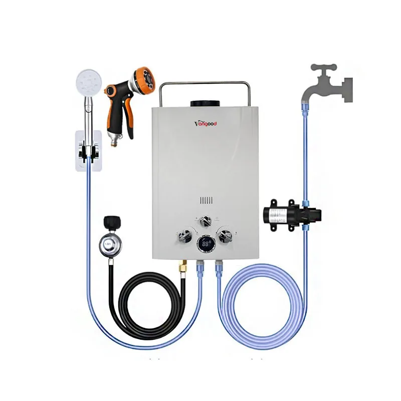 Mixed Color | Gas Water Heater + On/Off Shower Head & Stainless Steel Water Hose + Gas Regulator & Hose + Water Pump & Hose + Quick Connectors |