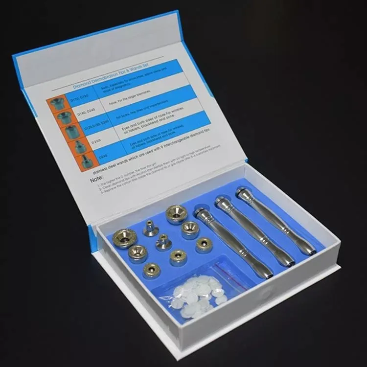 Описание продукта: принцип: кислородный спрей и Алмазная дермабразия машина обеспечивает нехирургическую процедуру очистки кожи, с помощью стерильных алмазных головок для абразивной или потереть верхний слой кожи, затем удалите частицы вместе с любой грязью и омертвевшей кожей. Эта процедура удаляет остатки кожи, дефекты, пятна, морщины и нежелательные пигментации на коже. Умеренное использование алмазной дермабразии, сопровождается продуктами кожи, которые проникают через верхний слой кожи, который достигает уровня дермы, помогает восполнять натуральные питательные вещества, восстанавливает активность клеток и способствует здоровью кожи. Результаты после лечения микродермабразии обычно являются здоровой, светящейся, красивой кожей. 9 шт. алмазные наконечники лазерной резки: 1 ea D80, D100, D120, D150, D180 и D220 наконечник 1 ea D160, d180-Точные наконечники для точной дермабразии лица и вокруг глаз 1 ea Гладкий наконечник-только для очистки кожи, без действия дермабразии * две ручки для дермабразии (Более длинная и высококачественная нержавеющая сталь) (11 мм хлопковый фильтр действует в качестве первого улавливания мертвых клеток кожи, пылесосов устройством.) Очищающее средство (очищающее) ---- лосьон для баланса --- микродермабразия ---- массажный крем (5 мин) --- нанесение маски --- лосьон для баланса --- эссенция ---- омоложение крем -- увлажняющее изолированное молоко.