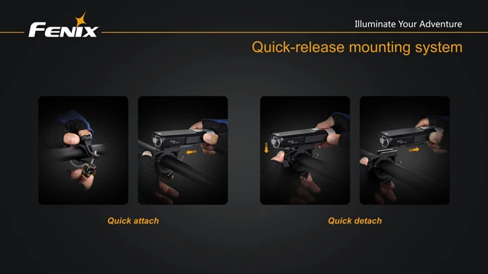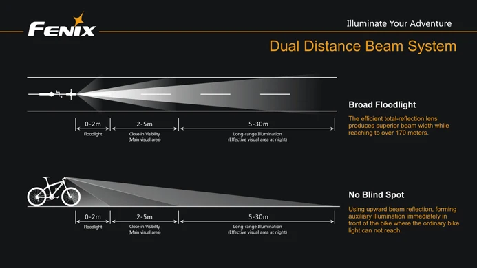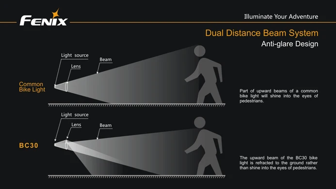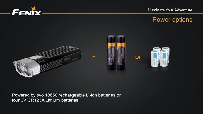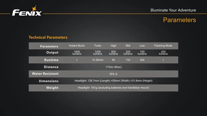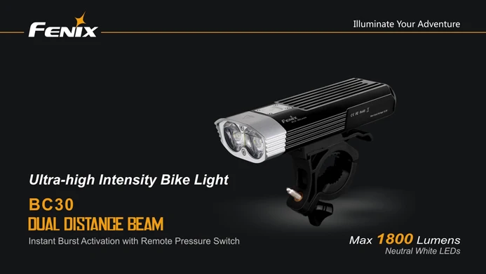 Описание товара Светодиодный светильник для велосипеда Fenix BC30 включает максимум 1800 люменов и максимальное время работы 20 часов. Светодиодный индикатор Cree XM-L2 нейтрального белого цвета на Fenix BC30 обеспечивает максимальное расстояние луча 557 футов при разрыве на 1800 люмен. Включенный дистанционный переключатель давления позволит быстро и легко получить доступ к режиму burst. Fenix BC30 работает от двух аккумуляторов 18650 или другого варианта будет четыре батареи CR123A. Совместим с велосипедным креплением ALB-10 Технические характеристики Использует два светодиода Cree XM-L2 нейтрального белого цвета Четыре режима работы: Турбо: 1200 люменов (1 час 50 мин.) Высота: 500 люмен (5 часов) Середина: 200 люменов (11 часов) Низкий: 100 люмен (20 часов) Мгновенный всплеск: 1800 люменов Режим мигания: 200 люмен Максимальное расстояние: 170 метров (557 футов) Максимальная мощность 1800-люмен Активация мгновенного разрыва с дистанционным переключателем давления Система двойного расстояния 4 уровня яркости Плюс предупредительный режим Цифровой выход-поддерживает постоянную яркость Быстро прикрепить и отсоединить руль размер для 22 мм-35 мм руля Легкая и надежная Регулировка направления светильник Изготовлен из алюминиевого сплава и качественного пластика 0 - 30 градусов горизонтальной регулировки и любой вертикальной регулировки, чтобы удовлетворить ваши различные потребности в освещении Высококачественный съемный резиновый коврик для улучшения ударопрочности Инновационная система быстрой замены батареи для быстрой и легкой замены батареи Индикатор низкого заряда батареи IPX-6: нормальная функция при сильном дожде или густом тумане Нажмите здесь для руководства пользователя Fenix BC30 Размер светильник Длина: 5 дюймов/126,7 мм Ширина: 2 дюйма/50 мм Высота: 1,25 в такой стране, как./31,8 мм Вес: 5,7 oz. Нажмите на изображение для просмотра в полный размер/161 грамм (за исключением батарей и устанавливаемое на руль крепление) Использованные батареи (не входят в комплект) Две аккумуляторные батареи 18650 (принимает Fenix ARB-L18-2600, ARB-L18-2600U, ARB-L18-2900, ARB-L18-3500 или ARB-L18-3500U и Tenergy). Каждый из них имеет различную мАч. Чем выше мА · ч, тем дольше время работы между зарядами. Совместимые зарядные устройства для всех аккумуляторов 18650: ARE-X1, ARE-X1 +, ARE-X2 или ARE-C2 + Четыре неперезаряжаемых аккумулятора CR123A. (Fenix не рекомендует аккумуляторы CR123, так как они не будут работать в соответствии с таблицей спецификаций, включенной для BC30) В комплект входит велосипедный светильник 1 - Fenix BC30 светодиодный велосипедный светильник 1-крепление на руль 2 крепления на руль (одна толстая и одна тонкая) 1-дистанционный переключатель давления 2-о-кольца (один черный и один красный)