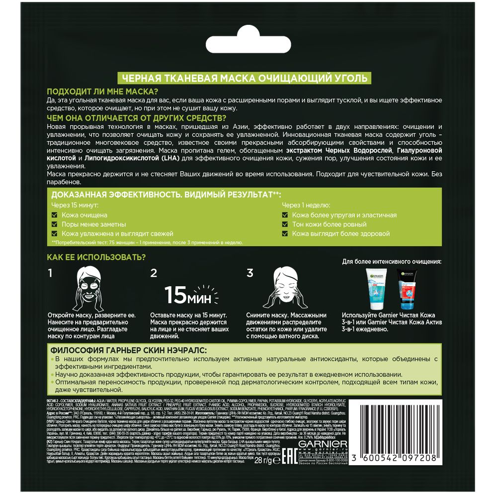 Garnier Черная Тканевая маска для лица "Очищающий Уголь + Черные водоросли" с гиалуроновой кислотой, увлажняющая, сужающая поры, для кожи с расширенными порами, 28 гр.