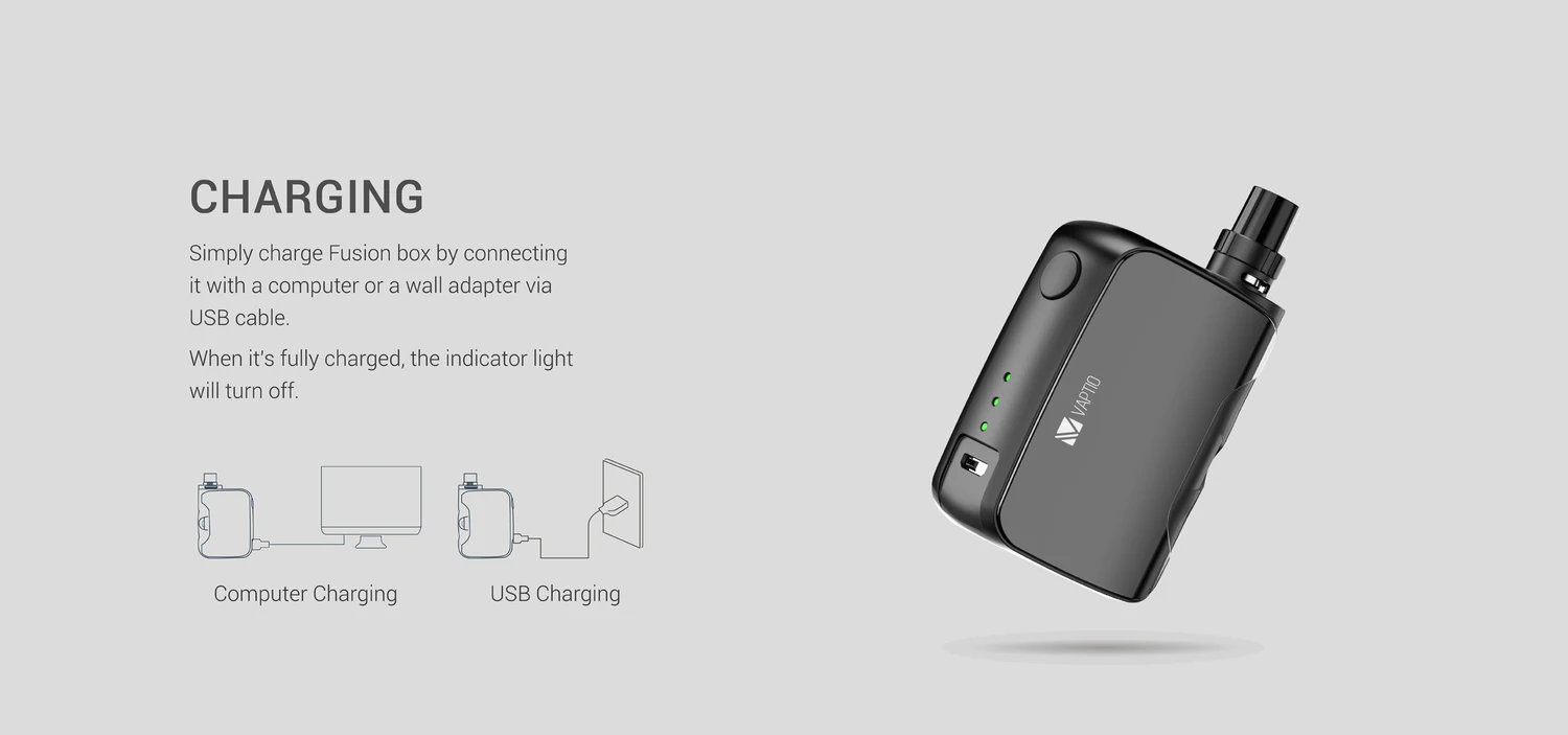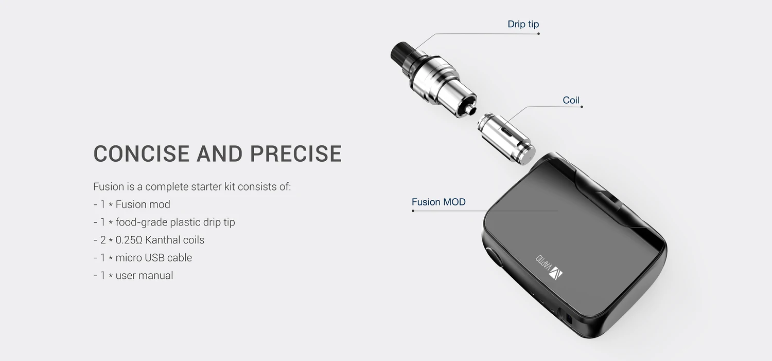 Комплект пало • Дизайн «Все в одном», простота использования • Верхний поток воздуха, благоприятный и герметичный • Возможность MTL и мелкого DL • Компактный и портативный • Удобное заполнение сверху Набор FUSION 50W • Включен детский замок, предотвращающий случайное расчленение атомайзера из Мода • Usb-зарядка с ПК или настенным адаптером • Простое наполнение • Легкое изменение головок катушки • Множественная защита: 10 м автоматическая защита блокировки, защита от короткого замыкания, защита от низкого напряжения, защита от перезарядки