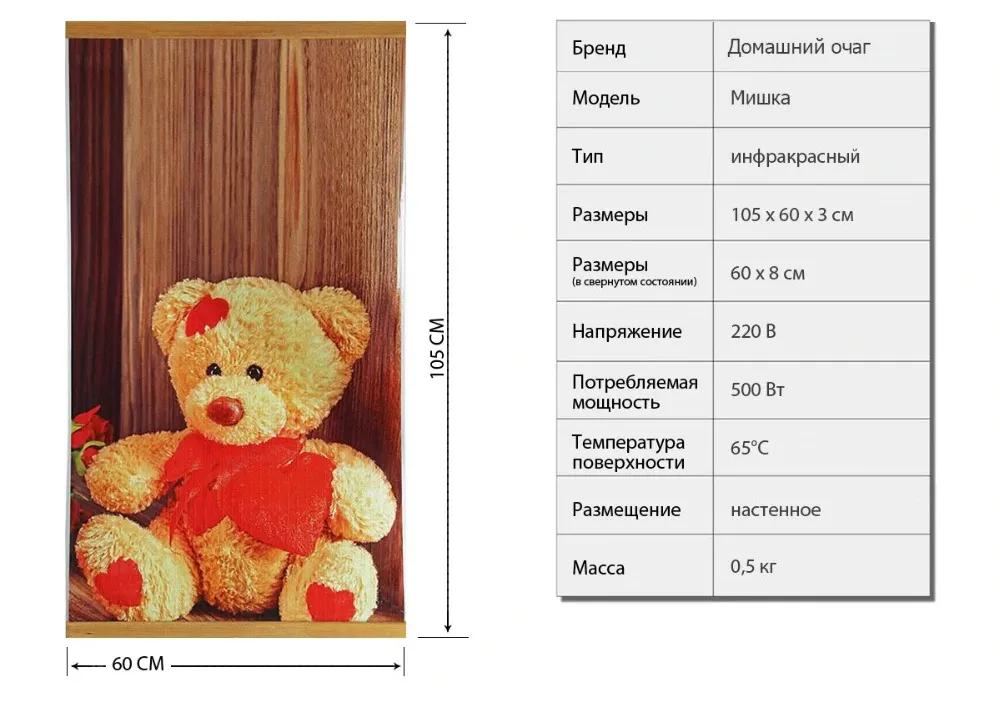Пленочный инфракрасный обогреватель-картина "Мишка", 500 ВТ обеспечивает максимально естественный способ дополнительного обогрева помещения в холодное время года. Изделие производится по новой технологии, разработанной российскими учеными. Углеродные нити выделяют инфракрасное излучение, принцип действия которого схож с действием солнечного света.
