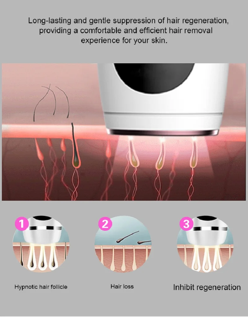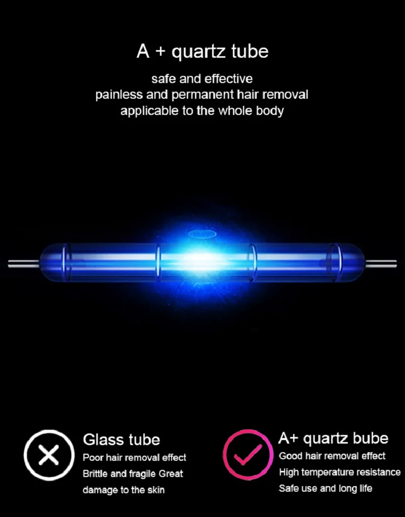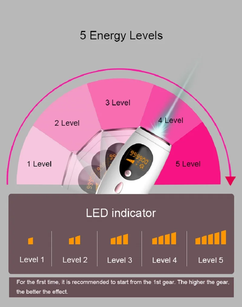 Одиночная вспышка + непрерывная вспышка (2 режима вспышки) Новое обновление 999900 flash/pulse. Маленький и стильный портативный Безопасно без побочных эффектов, безболезненно. Умеренное торможение регенерации волос. Применимо к телу подмышек бикини лица бороды руки и ноги частые части. Регулируемый уровень 1-5. Обновите интегрированный УФ-фильтр, не повреждая кожу. Обновите интегрированную систему защиты, чтобы предотвратить случайное повреждение глаз от вспышки. Можно использовать только контакт с кожей. Мир может быть использован, он имеет штепсельную вилку каждой страны, напряжение во всем мире совместимо. Длинный шнур питания. На английском, китайском языках.