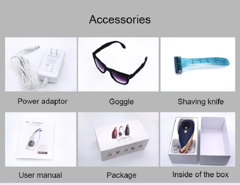 Эпилятор * 1 Бритва * 1 Очки * 1 Руководство * 1 Адаптер * 1 Посылка * 1