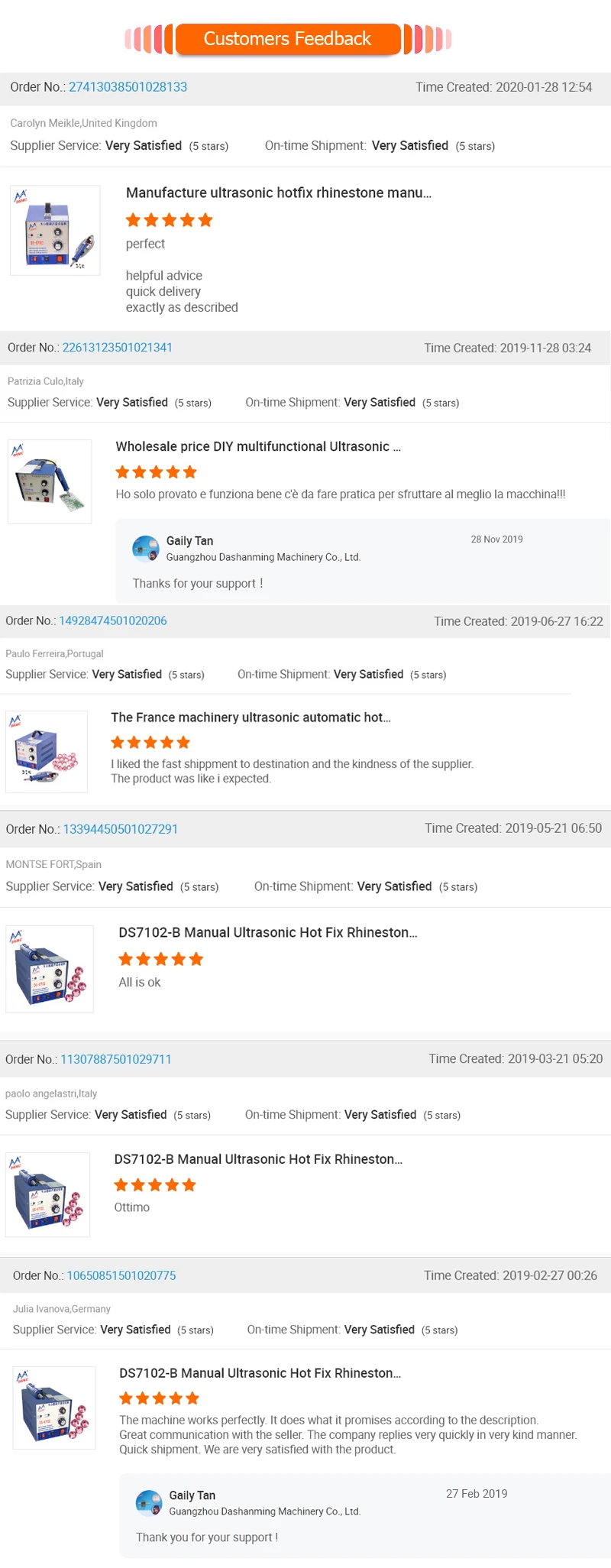 Guangzhou Dashanming Machinery Co., Ltd. (Dashan Machinery), основанная около 20 лет, занимается исследованиями, разработками, производством, продажами и обслуживанием в одной компании. Компания специализируется на производстве ультразвукового, лазерного режущего станка, станка с ЧПУ (Гравировальный/резной станок), (пневматический/гидравлический) термопереводного пресса и стразы, ультразвуковая машина для горячей фиксации стразы, более того, Мы фокусируемся на настройке нестандартной машины в соответствии с требованиями клиентов. Люди ориентированы, научный менеджмент, технологии во-первых, исключительное качество, честность и практичность, доверие и поддержка клиентов в стране и за рубежом. Наша цель-позволить продукту и обслуживанию нас завоевать репутацию по всему миру!