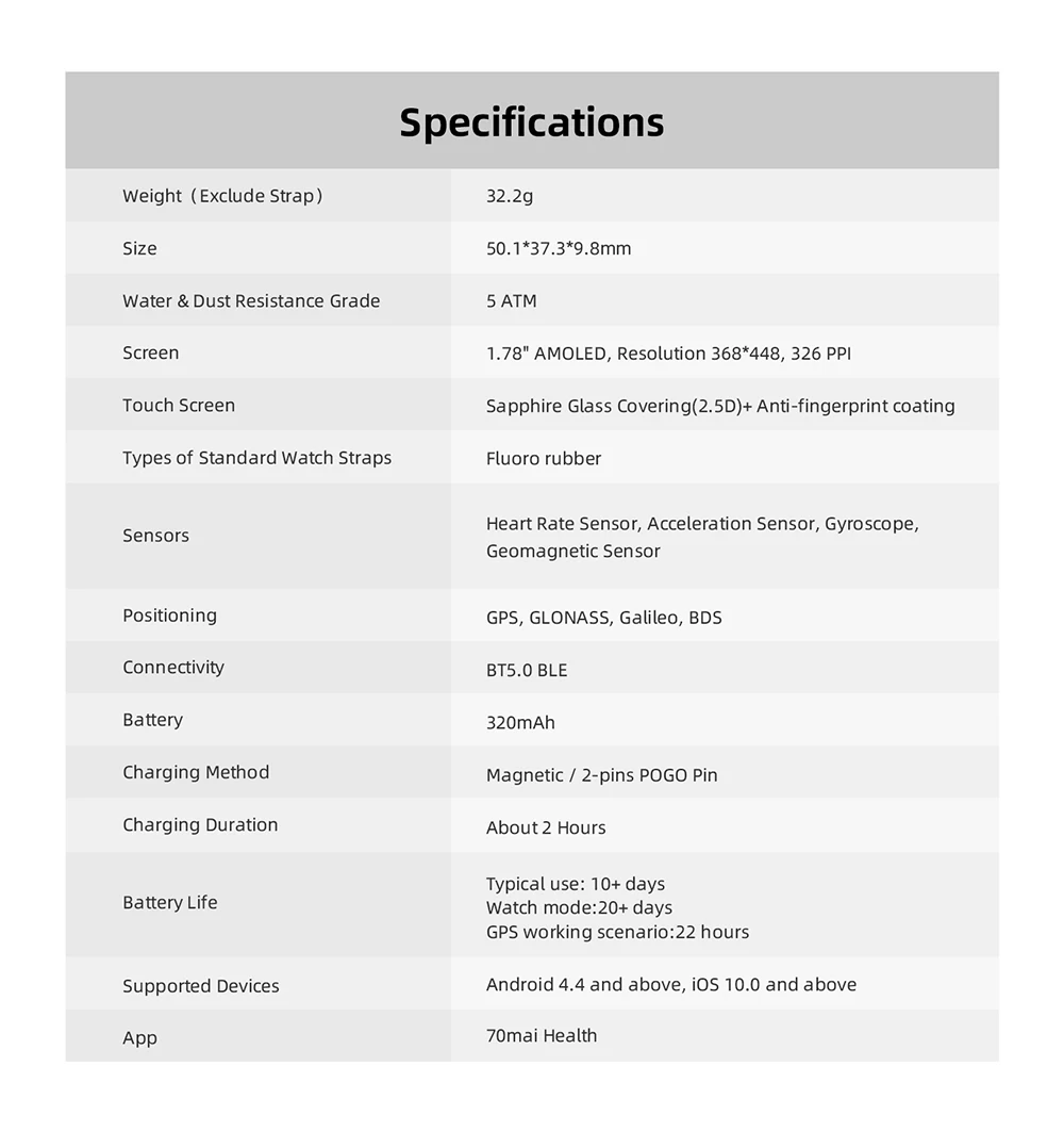 Часы 70mai Saphir могут непрерывно работать в течение 10 + дней в режиме основных часов и до 22 часов с непрерывной работой GPS.Maimo