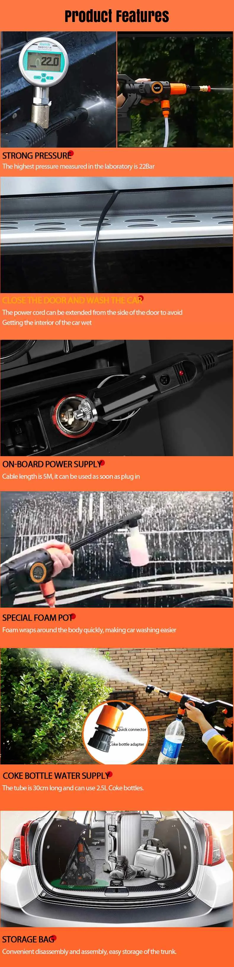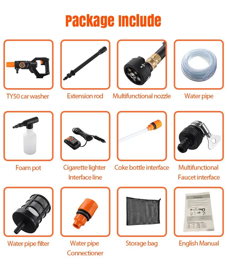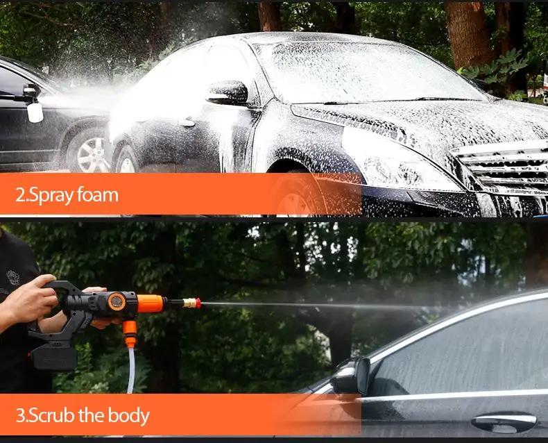 2. Вы можете использовать прикуриватель с выходным напряжением 12-20 в для подачи питания, подключения и мытья, не бойтесь забыть зарядку и не сможете ее использовать. Длина шнура прикуривателя 5 м позволяет мыть автомобиль в широком диапазоне.