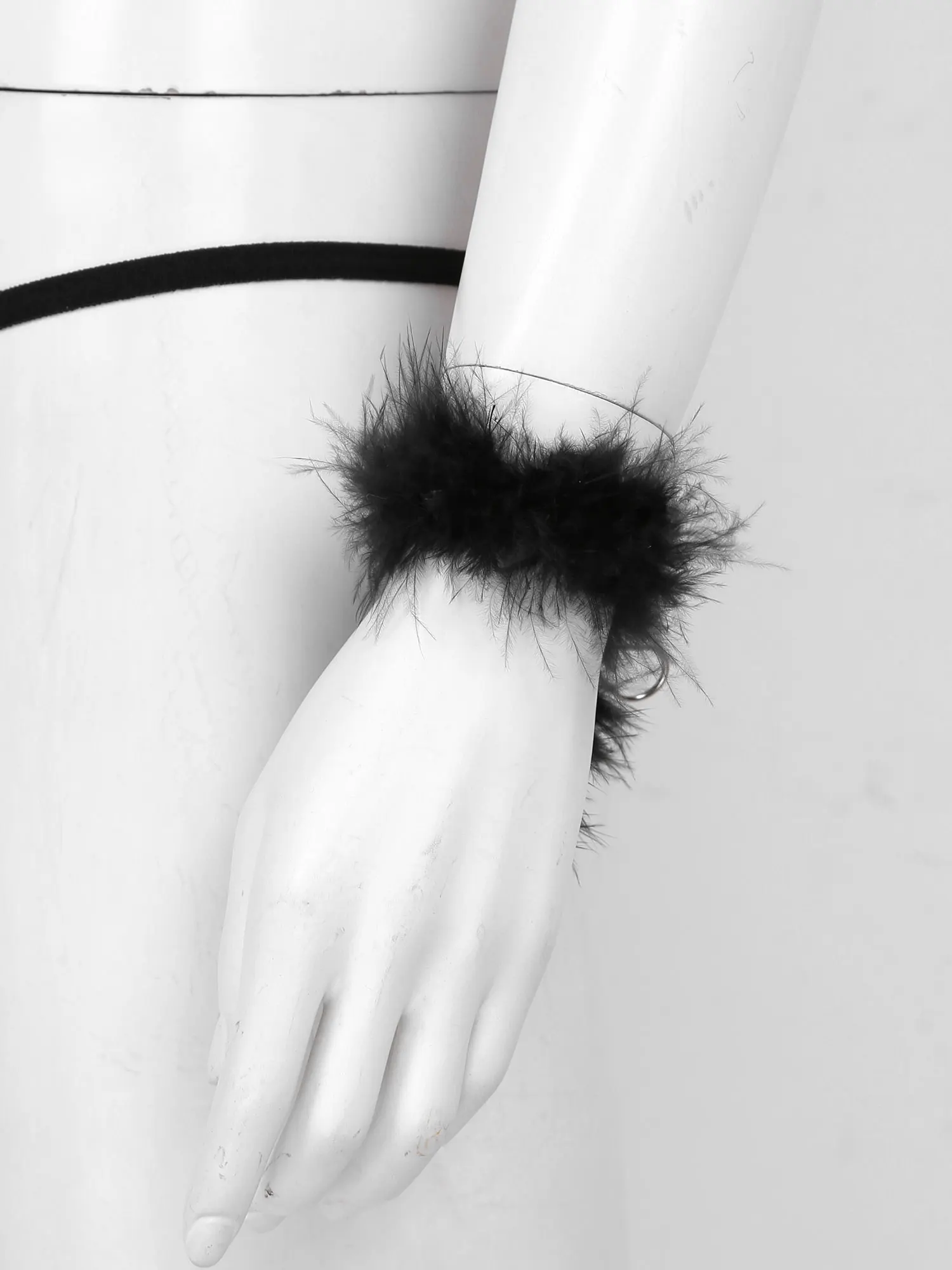 Комплект нижнего белья включает топ из бюстгальтера с бретелькой на шее и шнуровкой, трусы с Т-образной спинкой, браслет с пером, головную повязку с кошачьими ушками.