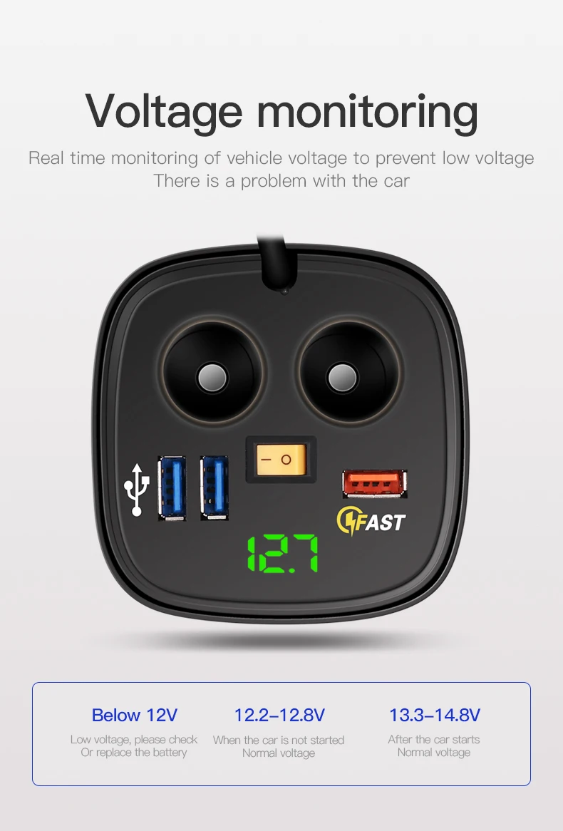 Обеспечивает полную мощность до 80 Вт, достаточно для одновременного использования различных портативных приборов, таких как dash camera, GPS, подогреватель сидений, пылесос, увлажнитель автомобиля, воздушный насос, очиститель воздуха, bluetooth-гарнитура.