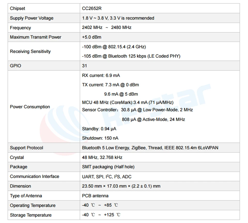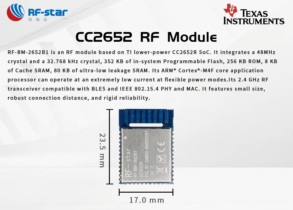 RF-BM-2652B1-радиочастотный модуль на основе TI с низким энергопотреблением CC2652R SoC. Он объединяет Кристалл 48 МГц и кристалл 32,768 кГц, 352 КБ программируемой в системе флэш-памяти, 256 Кб ПЗУ, 8 КБ кэш-памяти SRAM, 80 КБ сверхнизкой утечки. Его рука®Кортекс®-Процессор приложения M4F core может работать при чрезвычайно низком токе при гибких режимах мощности. РЧ-приемопередатчик 2,4 ГГц, совместимый с Bluetooth 5 с низким энергопотреблением и IEEE 802.15.4 PHY и MAC. Он отличается небольшим размером, надежным расстоянием подключения и жесткой надежностью.