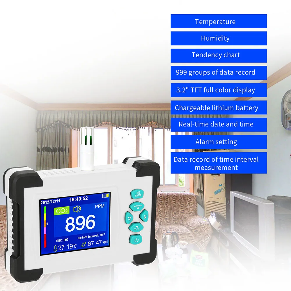 Многофункциональный:Это не только профессиональный детектор углекислого газа, но также может измерять температуру окружающей среды и относительную влажность. Оснащен 3,2-дюймовый цветной HD дисплей, легко читаемый.