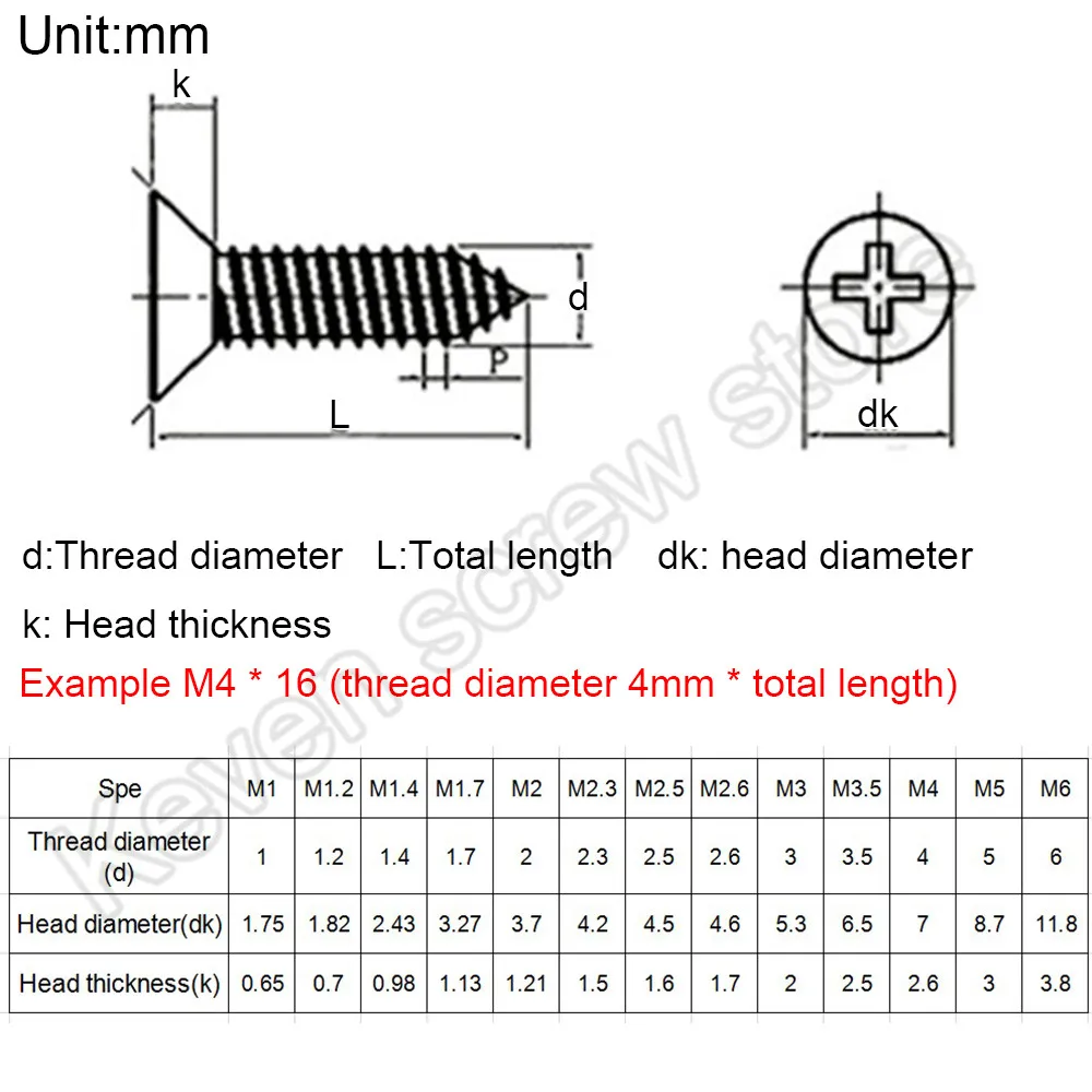 Example M4 * 16 (thread diameter*total length) including head length