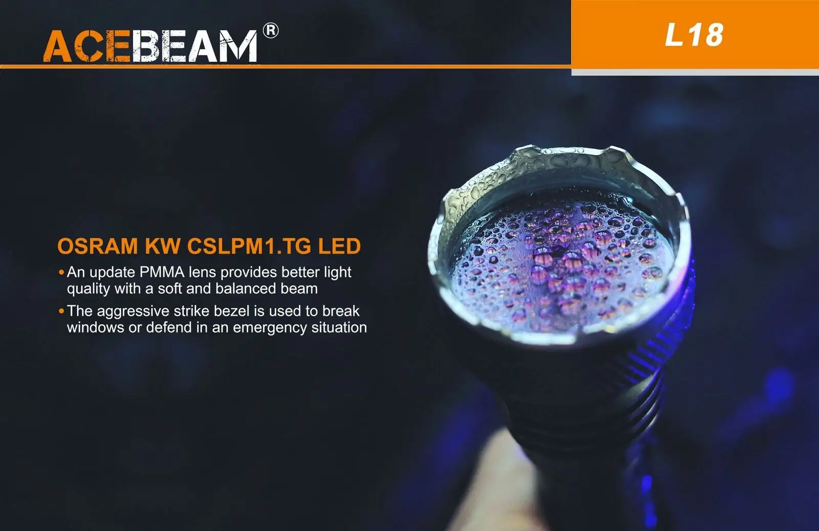 Более длинный луч помогает охотникам или пользователям легче определить свою добычу или цель. Acebeam L18-это новый тактический осветительный светильник, который бросает впечатляющий дальний светильник. Благодаря компактному размеру, он обеспечивает максимальный выход 1500 люмен и А (макс.) unbelieveable Пледы из 1000 метров. Питание от одного аккумулятора 5100 мАч 21700, максимальное время работы достигает 94 дней. С оптическим объективом TIR L18 создает мягкий и сбалансированный луч. Этот мощный тактический фонарик идеально подходит для профессионального выбора охоты, поисково-спасательных работ, работы, правоохранительных органов и активного отдыха.