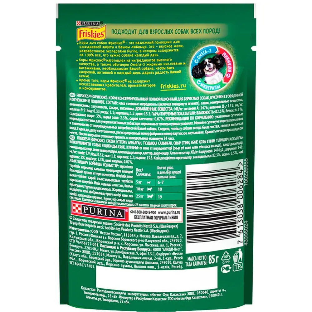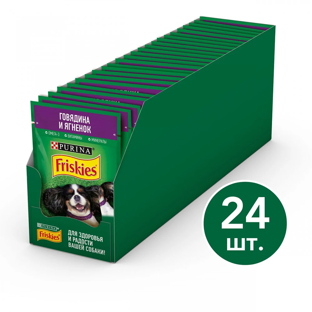 Влажный корм Friskies® для взрослых собак, кусочки с говядиной и ягненком в подливе, 24 шт по 85 г