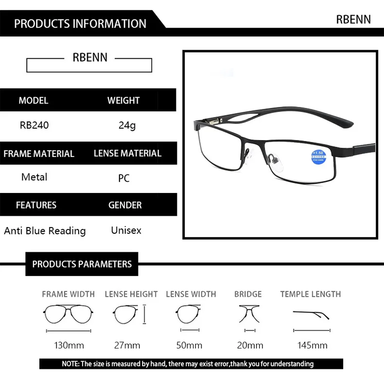 Мужские очки для чтения RBENN, маленькие очки в металлической оправе с защитой от сисветильник света, деловые компьютерные очки с блокировкой сисветильник + 0,75 1,75 2,75