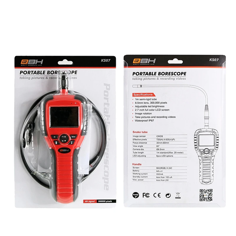 2,7 дюймов сенсорный экран Аудио-видео сигнал 8,5 мм Диаметр зонда змея, 300000 пикселей Вращение изображения на экране и регулировка яркости, LED Регулируемая яркость Поддержка съемки фотографий и видеозаписи TF карта Макс 32G 4 шт. AA батареи питания (питание литием Батарея как опционально) (не входит в комплект)Аксессуары в комплекте: