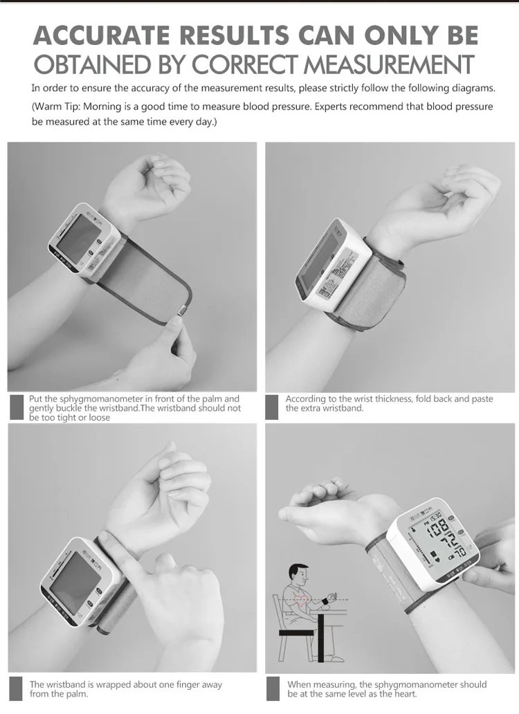Продукт Особенности ↓↓↓↓↓↓ Используя осциллометрическое измерение кровяного давления, точно Измерьте кровяное давление ЖК-цифровой дисплей, разборчивый Интеллектуальное давление Функция оповещения ВОЗ Двойной режим, каждый из 99 наборов измерений памяти Без работы в течение 1 минуты автоматическое выключение Неправильное измерение сердцебиения. Функция часов Функция защиты от избыточного давления. Технические характеристики и технические параметры: ↓↓↓↓↓↓ 1. Режим отображения: жидкокристаллический дисплей (ЖК-дисплей) 2. Метод измерения: интеллектуальное давление, осциллометрическое измерение 3, мощность: DC 3v (1,5 v 2 * AAA батареи, не включает в себя аккумулятор) 4. Диапазон измерения: Кровяное давление: (0-280) мм рт. Ст./ (0-37) кПа (кровяное давление) Пульс: (40-199) раз/минуту 5, Точность: ± 3 мм рт. Ст./± 0,4кпа (кровяное давление) ± 5% (пульс) 6. Метод надувания: автоматическая инфляция 7, устройство утечки газа: дефляционный клапан 8, быстрая Дефляция: электронный дефляционный клапан 9, результаты показывают: высокое давление/низкое давление/пульс 10. Преобразование единиц измерения: преобразование мм рт. Ст./кПа (по умолчанию для загрузки-mmHg) 11, количество групп памяти: две группы памяти 99 12. Обнаружение низкой мощности: ЖК-дисплей с низким значением заряда батареи 13, Совет ВОЗ Предупреждение о кровяном давлении указывает на состояние здоровья кровяного давления 14, сообщение об ошибке: см. Таблицу 1 для получения подробной информации 15. Частота сердечных сокращений не такая, как у ЖК-дисплея, символ несоответствия сердечного ритма 16. Функция защиты от избыточного давления: Автоматическое давление воздуха над 295 мм рт. Ст. (20 мс) 17, функция автоматического отключения: без работы в течение 1 минуты автоматическое отключение 18, ток: Динамический ток <500 мА Тихий ток <30 мА Ток выключения <20uA 19. Условия работы A> Температура окружающей среды: 5 °C ~ 40 °C; B> Относительная влажность: ≤ 85%; C> Атмосферное давление: 85 кПа ~ 105 кПа