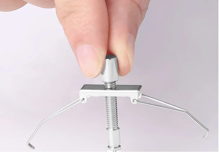 Ортодонтический прибор изготовлен из всего металла. По принципу рычага вложенный в мясо гвоздь постепенно вытаскивается,