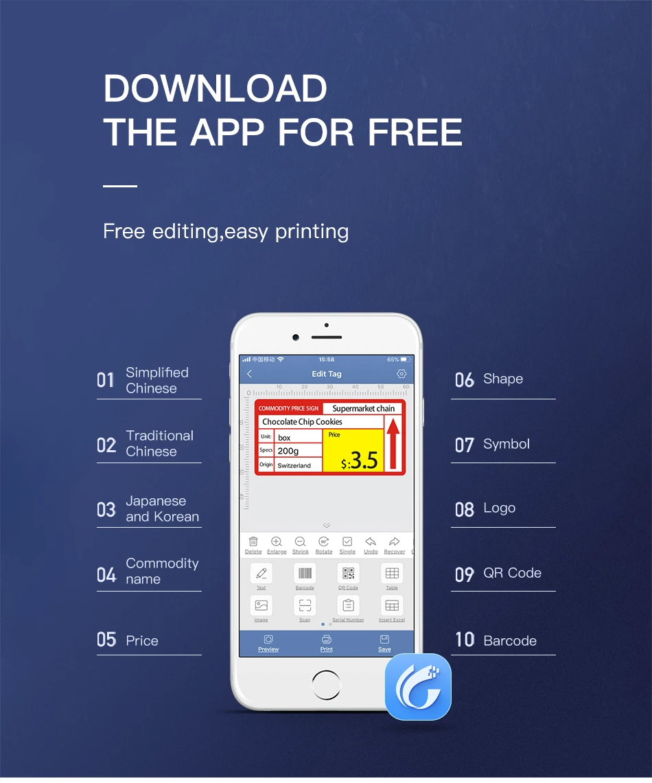 【Бесплатная печать этикеток 】: Печать этикеток более бесплатна, поддержка функции импорта excel, горизонтальная версия, вертикальная версия, время, 1D/2D штрих-код и печать стола, сканирование штрих-кодов, распознавание изображений и голоса и т. д. Приложение имеет много банка материалов, обогатит ваше создание этикеток.