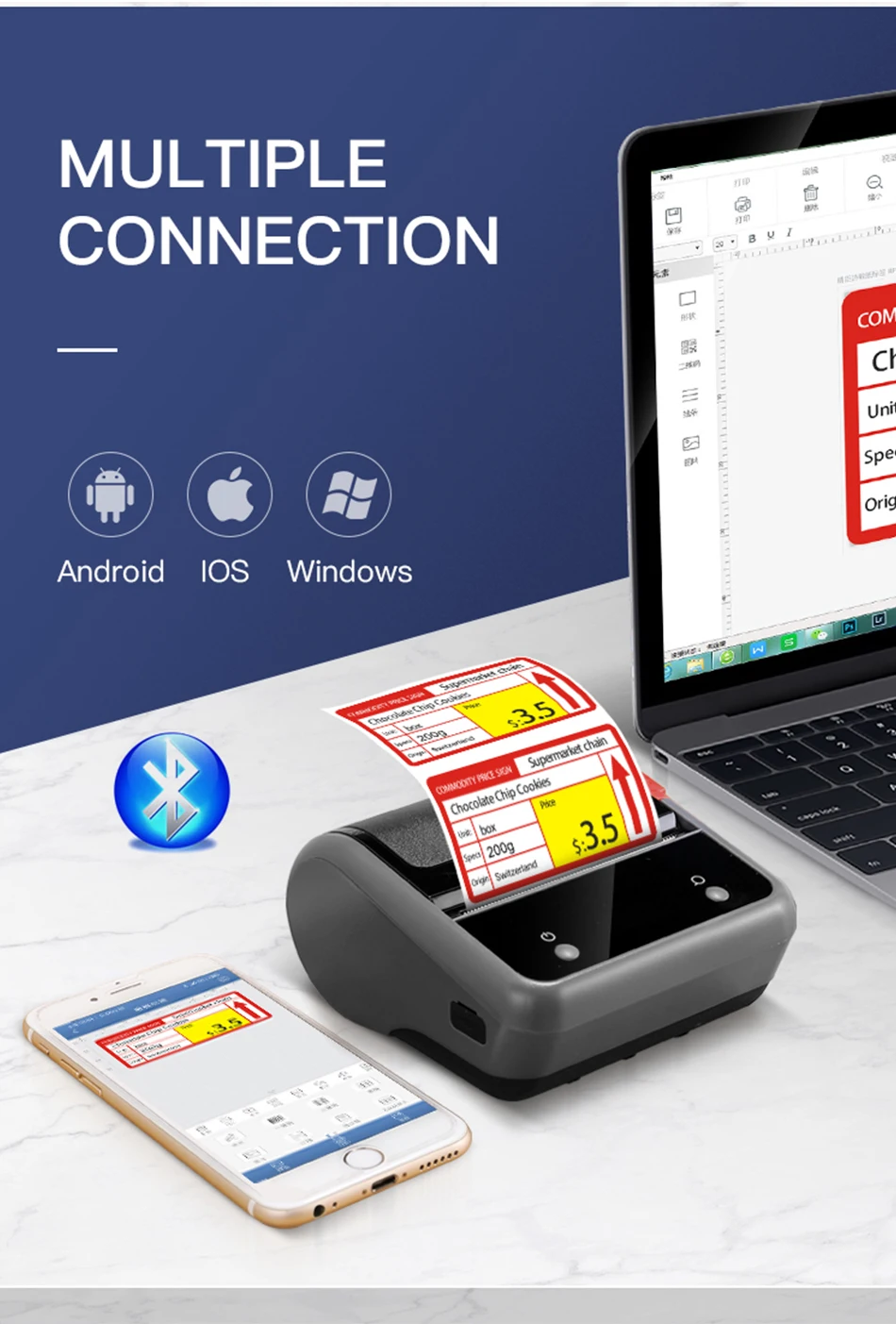 【Термопечать 】: Встроенный литий-ионный аккумулятор большой емкости 2200 мАч, работает при низком уровне шума, принтер использует технологию термопечати, чернильный картридж не нужен при использовании, низкая стоимость эксплуатации. Поддержка этикеток шириной 20-77 мм.