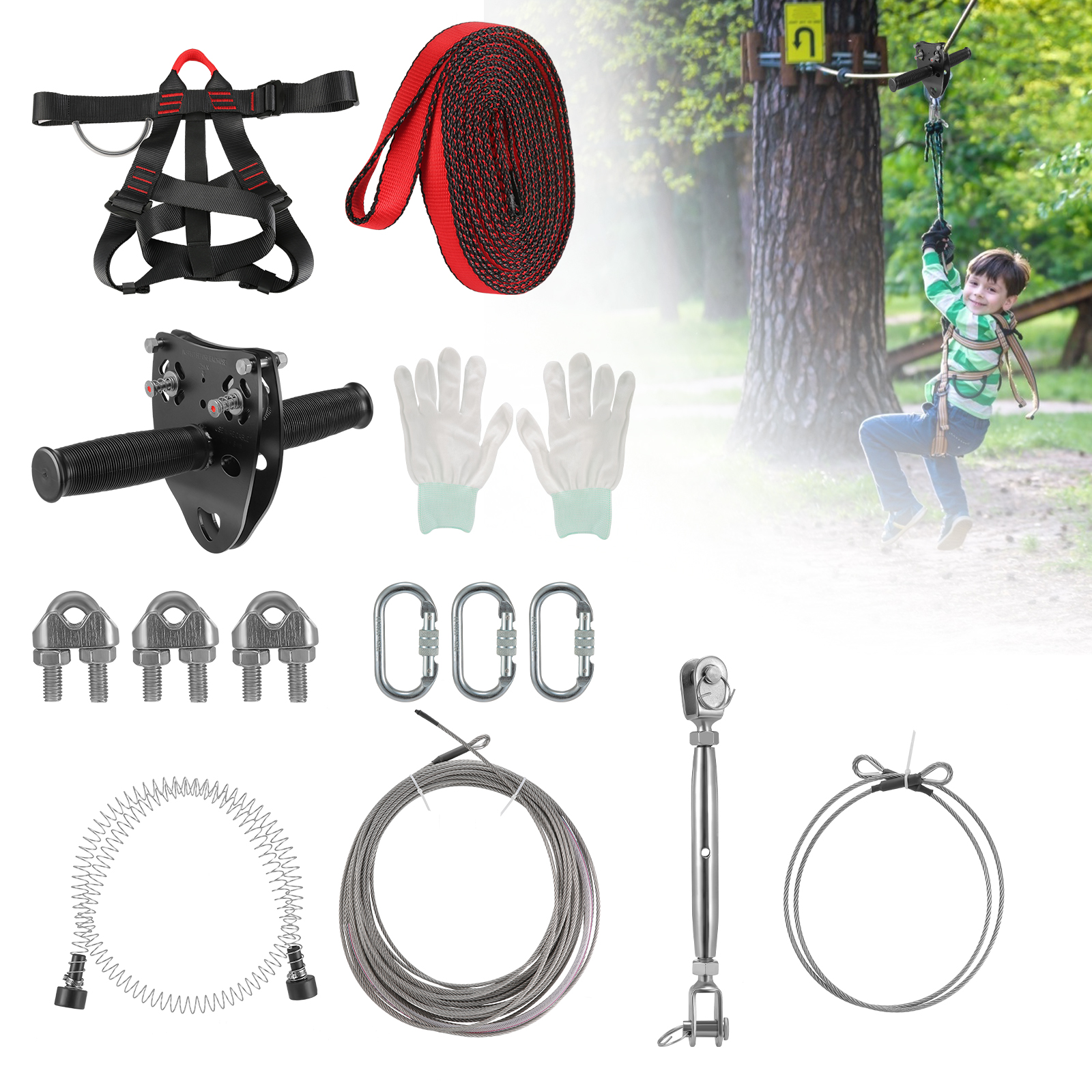 65/82/98/115FTZiplines kit, half body safety belt, with spring brake, adjustable harness, half open and close pulley, stainless steel cable, antiskid gloves, suitable for garden, courtyard, outdoor