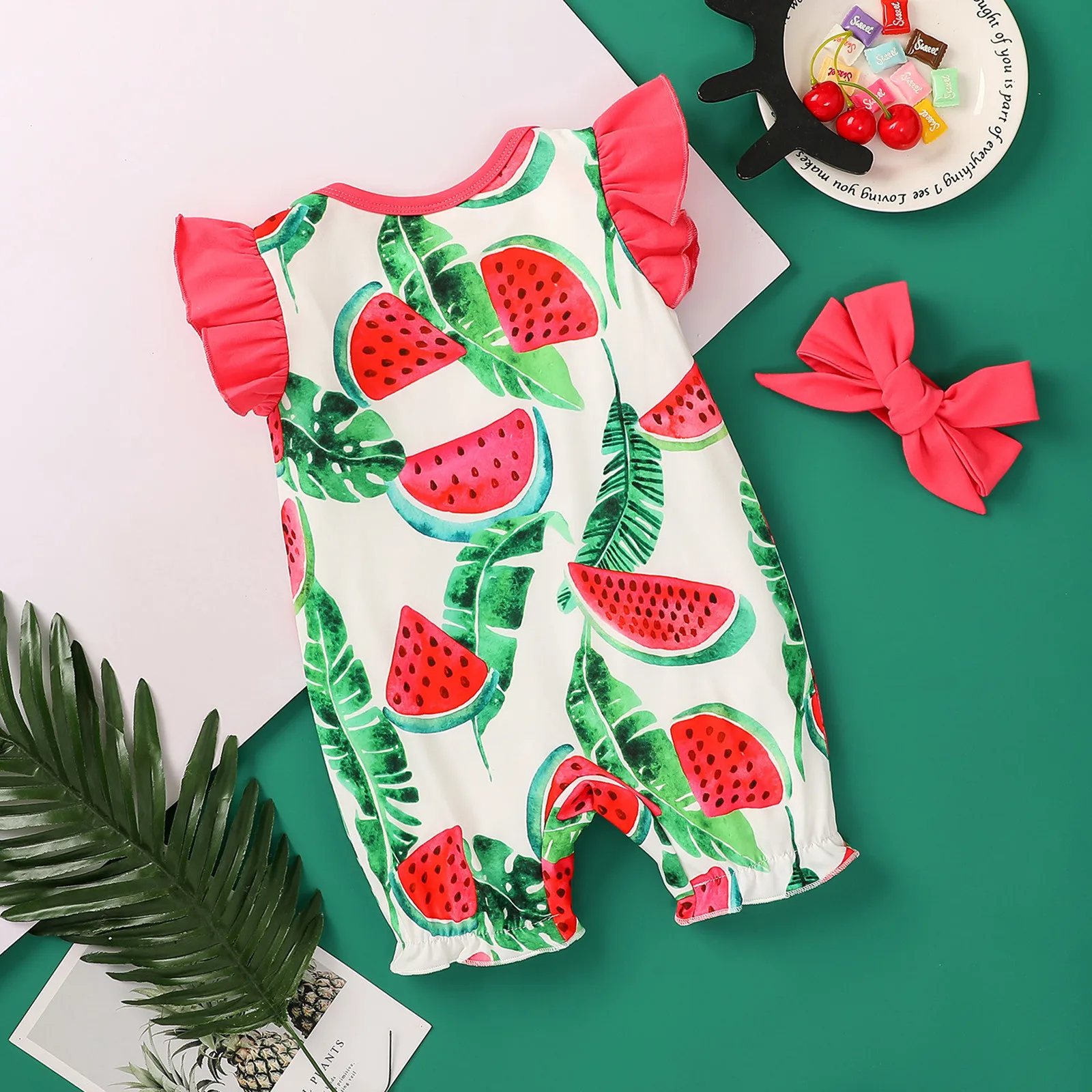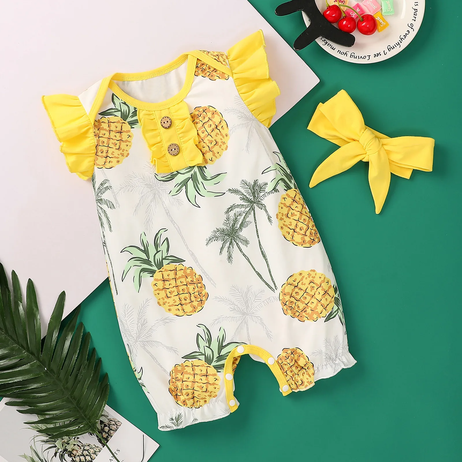 Комбинезон с рюшами и фруктовым принтом для новорожденных девочек + наборы повязок на голову