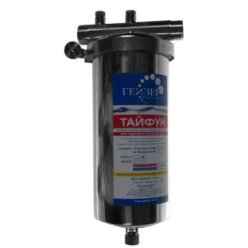 Корпус — это деталь универсального магистрального фильтра «Гейзер Тайфун 10 ВВ», который предназначен для горячего водоснабжения. Его изготавливают из прочной нержавеющей стали. Он состоит из колбы с крышкой, соединенных с помощью хомутового замка. Конструкция позволяет быстро произвести замену картриджа. На крышке корпуса есть клапан, предназначенный для сброса избыточного давления.