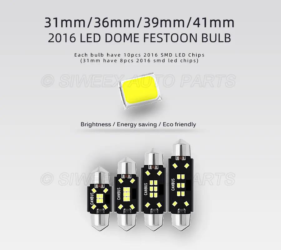 * Количество светодиодный: 10-2016 SMD на лампу (31 мм есть 8 шт 2016 SMD)