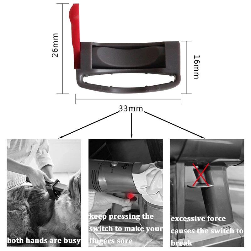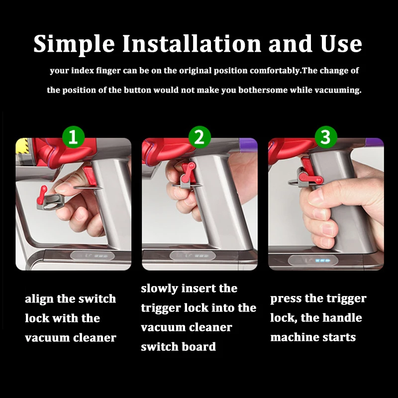 1. Кнопка блокировки устанавливается на кнопку питания пылесоса, который может легко и удобно использовать пылесос. Не нужно держать нажатие на кнопку во время пылесоса, и пальцы больше не болят.