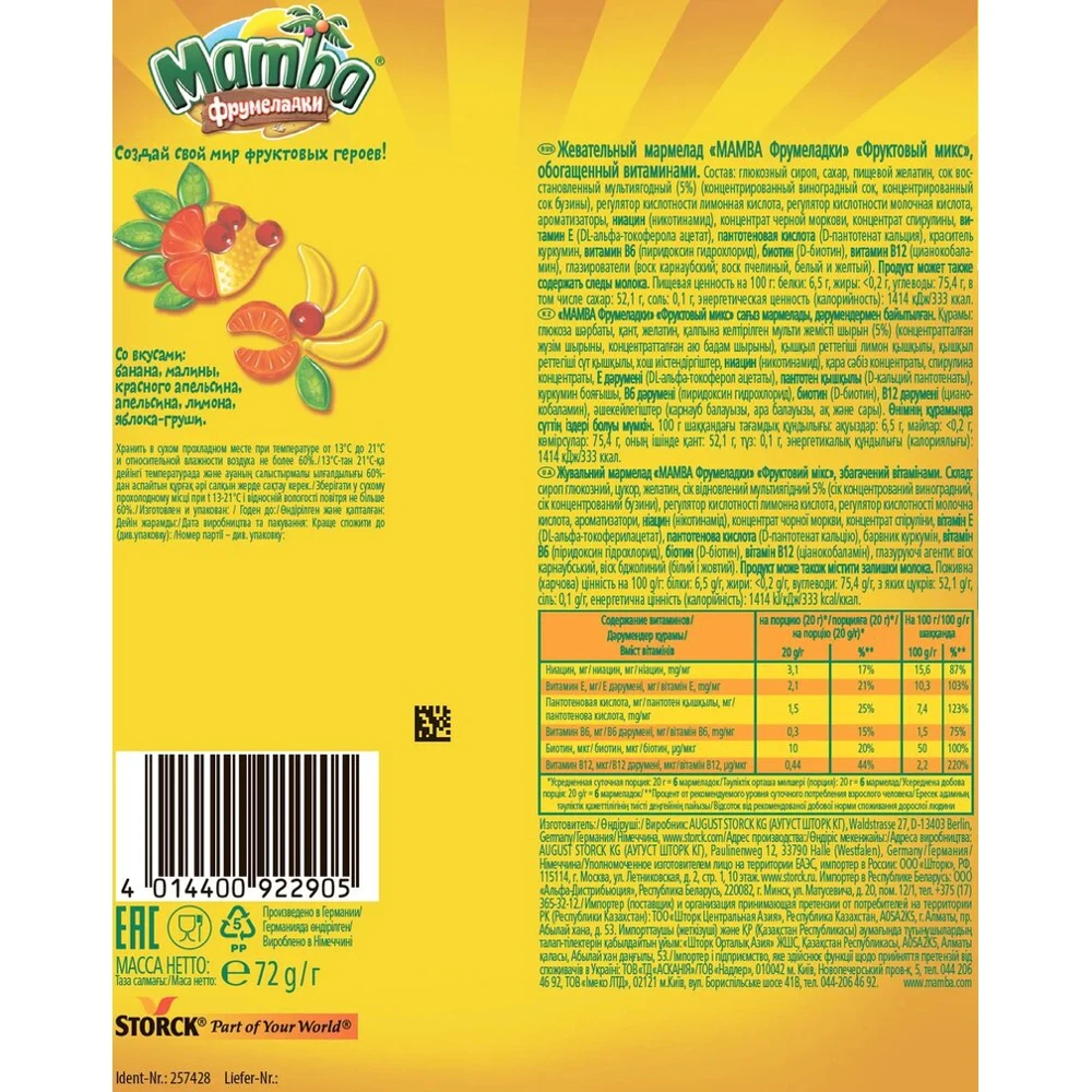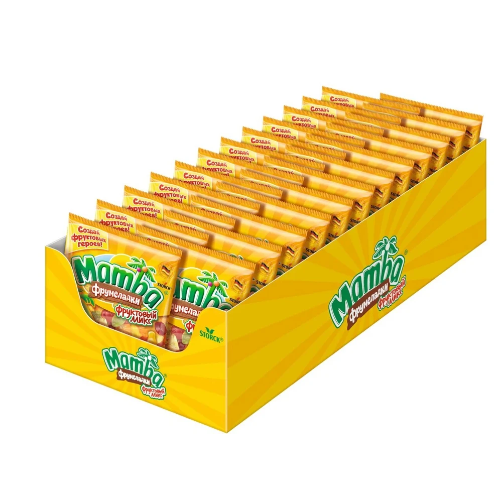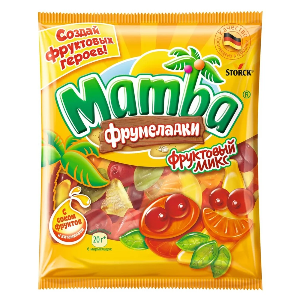 Mamba Фрумеладки - вкусные жевательные мармеладки c фруктовым соком и витаминами! Насладись отличным вкусом и получи заряд веселья и прекрасного настроения! А самое интересное – ты можешь с ними играть! Создай свой мир фруктовых героев Mamba Фрумеладки, складывая мармеладки различных форм и превращая их в новых веселых персонажей. Собери свою команду героев с острова Mambа! Mamba Фрумеладки «Фруктовый микс» - жевательный мармелад с ассорти из фруктовых вкусов, обогащенный витаминами.