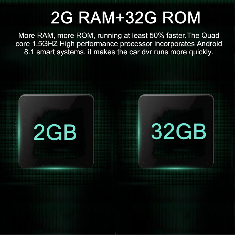 Четырехъядерный 1,5 ГГц высокопроизводительный процессор включает Android 8,1 интеллектуальных систем, плюс он собран в Оперативная память 2 Гб Встроенная память 32 ГБ, это делает видеорегистратор более плавным и обеспечивает несколько функций, что делает Автомобильный видеорегистратор более быстрым. Вы можете скачать любое приложение из магазина google play.