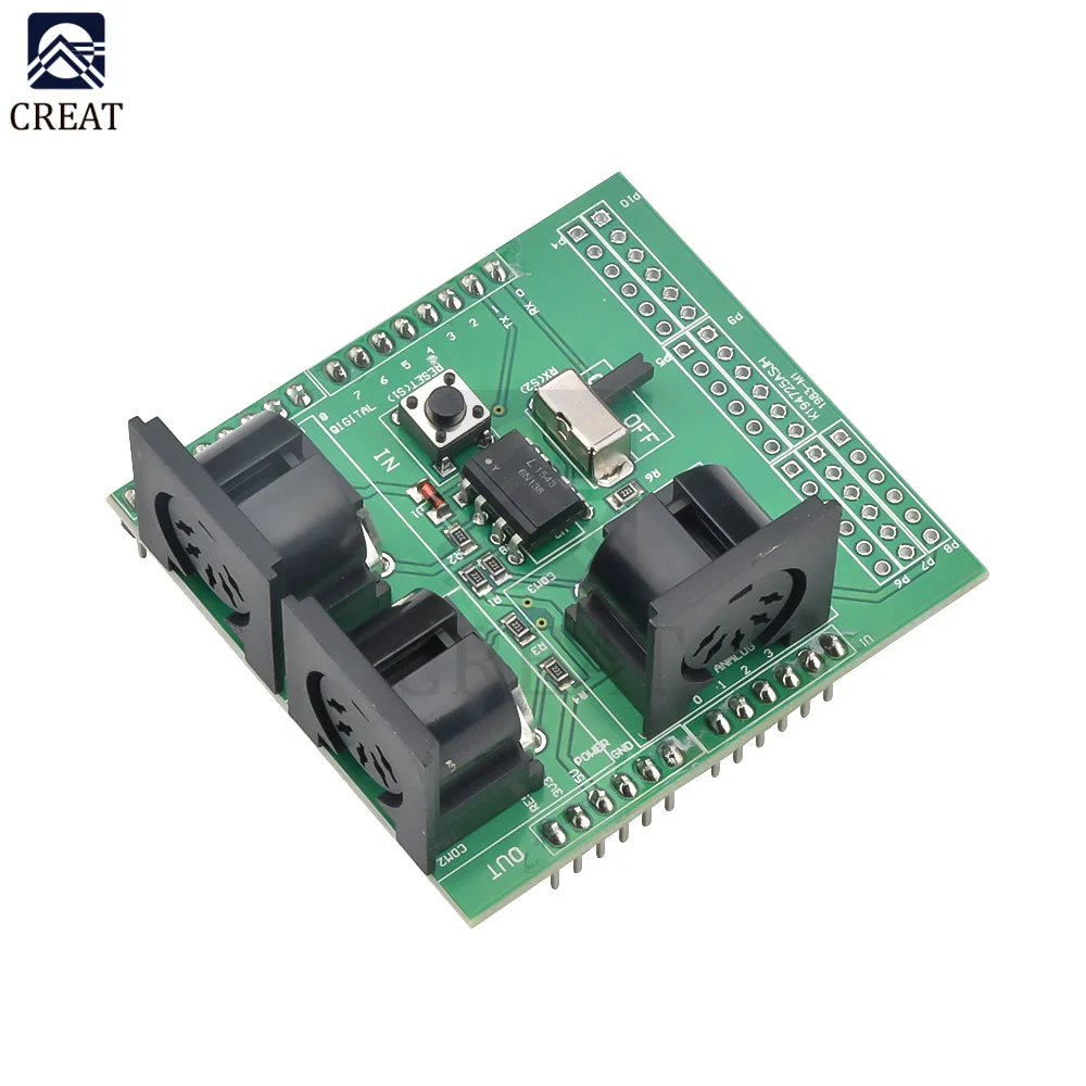 Плата адаптера MIDI обеспечивает подключение MIDI - IN и MIDI - OUT, а также порт MIDI THRU. MIDI-порт имеет световую изоляцию IN, чтобы предотвратить контур заземления. Плата адаптера MIDI может быть установлена непосредственно как экран в верхней части платы Arduino: Подключите MIDI - IN/THRU к аппаратному контакту Arduino RX, подключите MIDI - OUT к TX. Данные и аналоговый вывод, шина питания и шина могут передаваться.