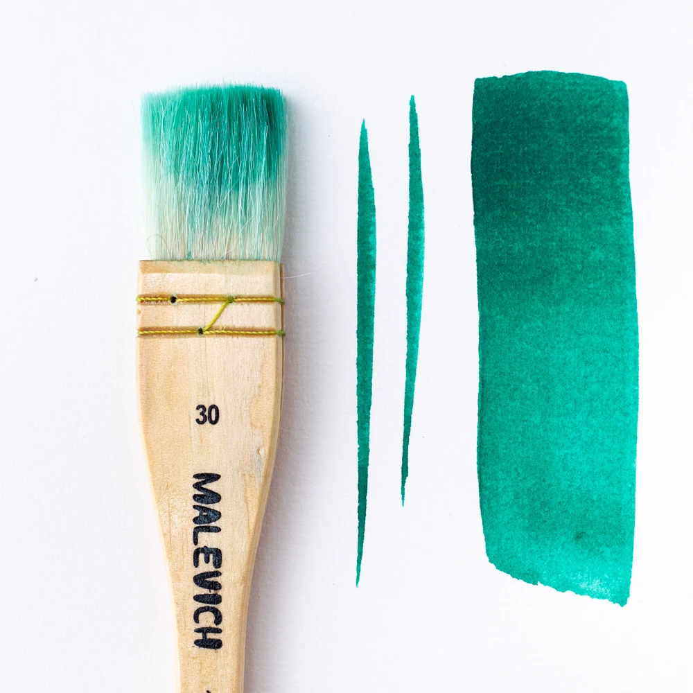 Флейц (широкая мягкая плоская кисть) из мягкого козьего ворса отлично подходят для смачивания большого акварельного листа, растяжки и набирания фона. Подходит она и для нанесения краски одним мазком или для свободной живописи заливками.