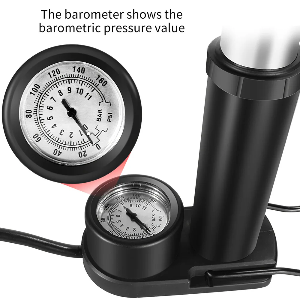 Оснащен манометром 120PSI. Исходя из манометра, вы можете выбрать, продолжать ли накачивать, чтобы сделать давление в шинах подходящим. Легко насос до 80 фунтов на квадратный дюйм.