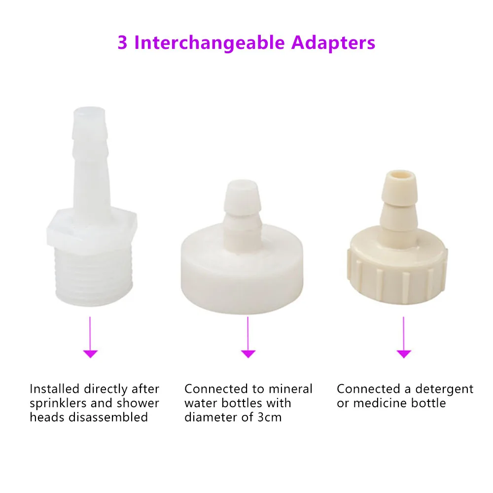 1. Оснащен 3 адаптерами для широкого диапазона применения, один может быть установлен непосредственно после разбрызгивателей и душевых головок, можно подключить бутылки с минеральной водой диаметром 3 см, а можно подключить моющее средство или бутылочку для лекарств.