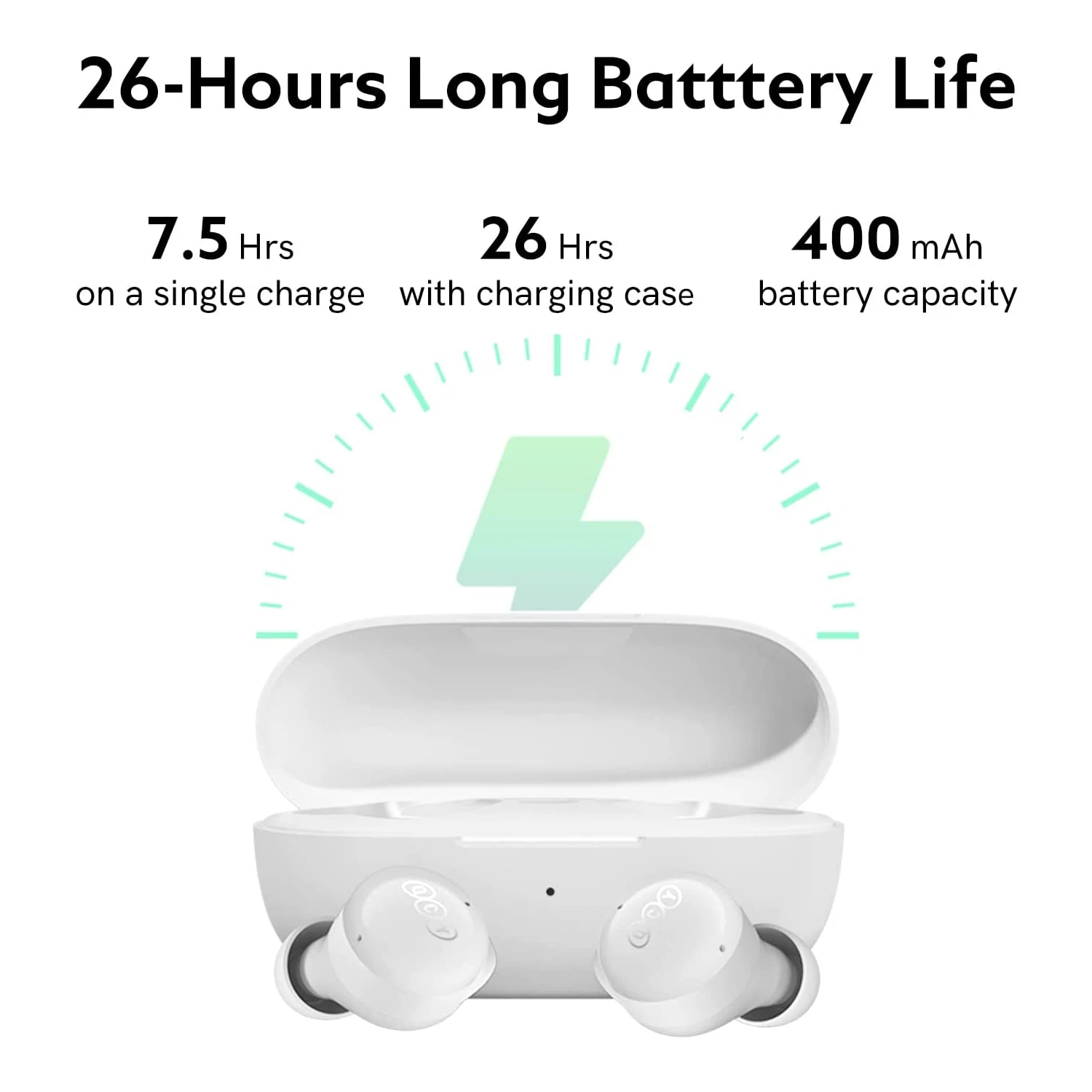 One top-up offers 7.5 hours of playback while the charging case extends it to 26 hours. Keep music playing!