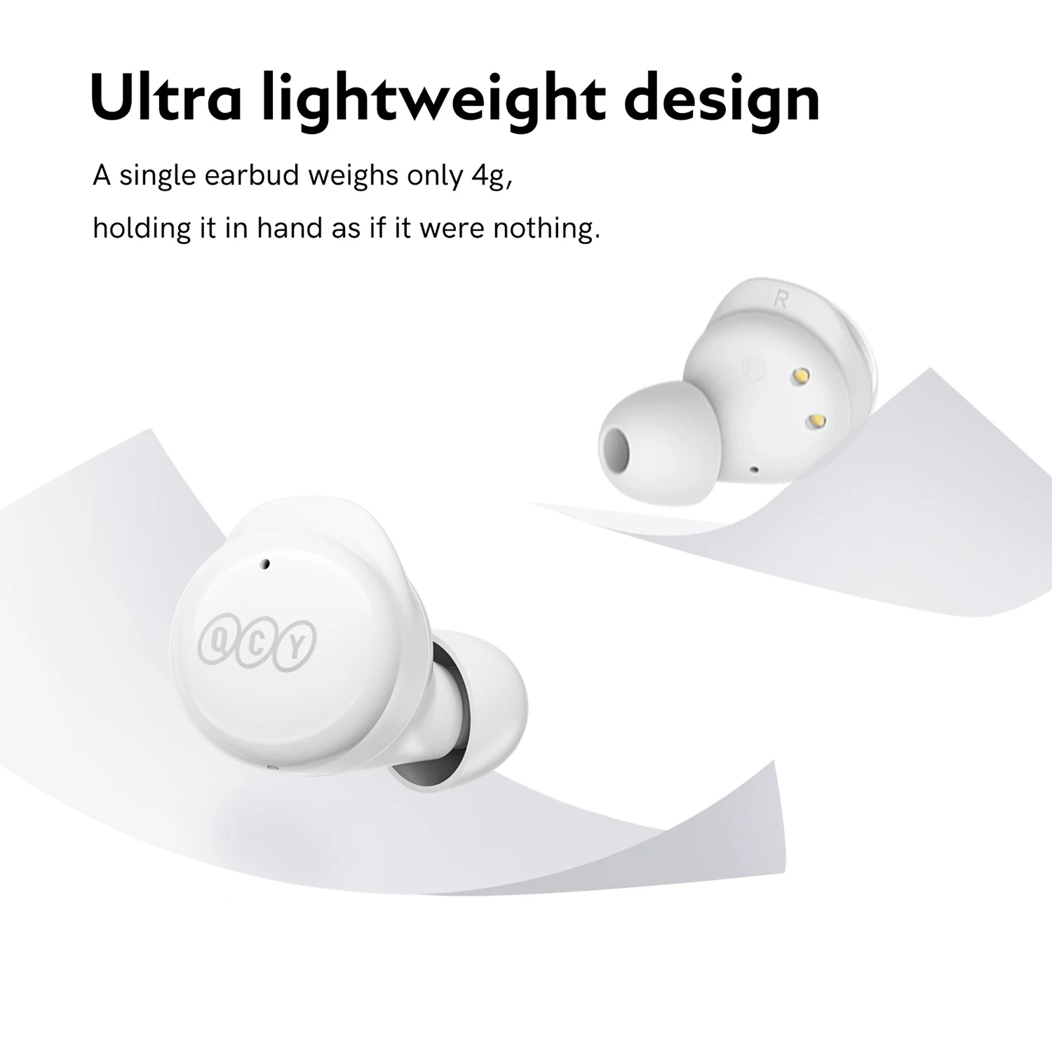 Based on a survey involving a large number of users, the earbuds fit you snugly. Single earbud, 4.2g only, is like an A4 paper, with senseless wearing experience.