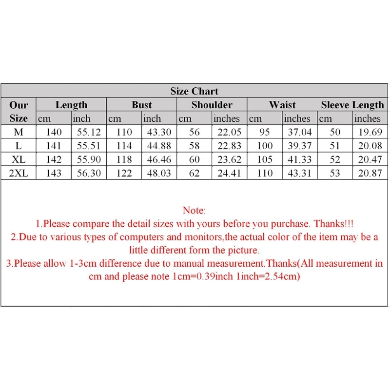 Размеры: 2XL Бюст: 122 см/48,03 дюйм (ов) Длина: 143 см/56,30 дюймов наплечный: 62 см/24,41 дюйм (ов) обхват талии: 110 см/43,31 дюйма рукав Длина: 53 см/20,87 дюйм (ов)
