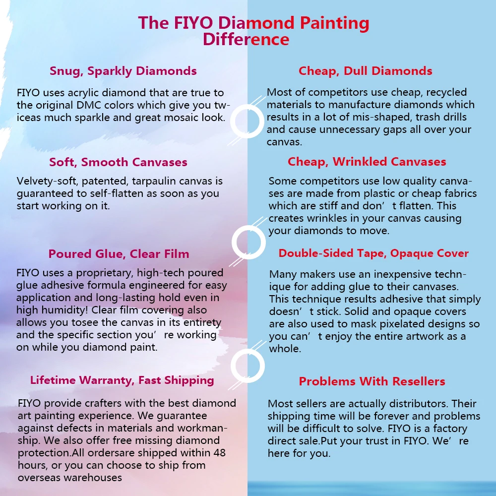 【Пожизненная гарантия, быстрая доставка 】:FIYO предоставляет crafters лучший опыт алмазной живописи. Мы гарантируем защиту от дефектов материалов и изготовления. Мы также предлагаем бесплатную защиту от недостающих алмазов. Все заказы отправляются в течение 48 часов.