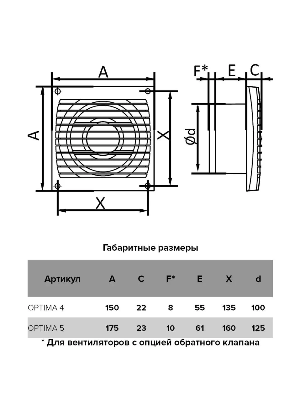 Вентилятор OPTIMA 5 применяется для постоянной или периодической вытяжной вентиляции санузлов, душевых, кухонь и других бытовых помещений.