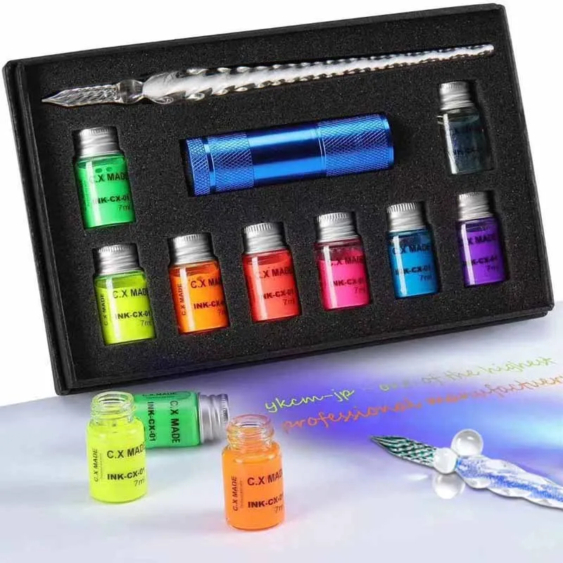 Набор стеклянных ручек позволяет создавать красивые секретные сообщения или иллюстрации в невидимых флуоресцентных чернилах, которые могут быть раскрыты только в темноте или ультрафиолетовом светильник.