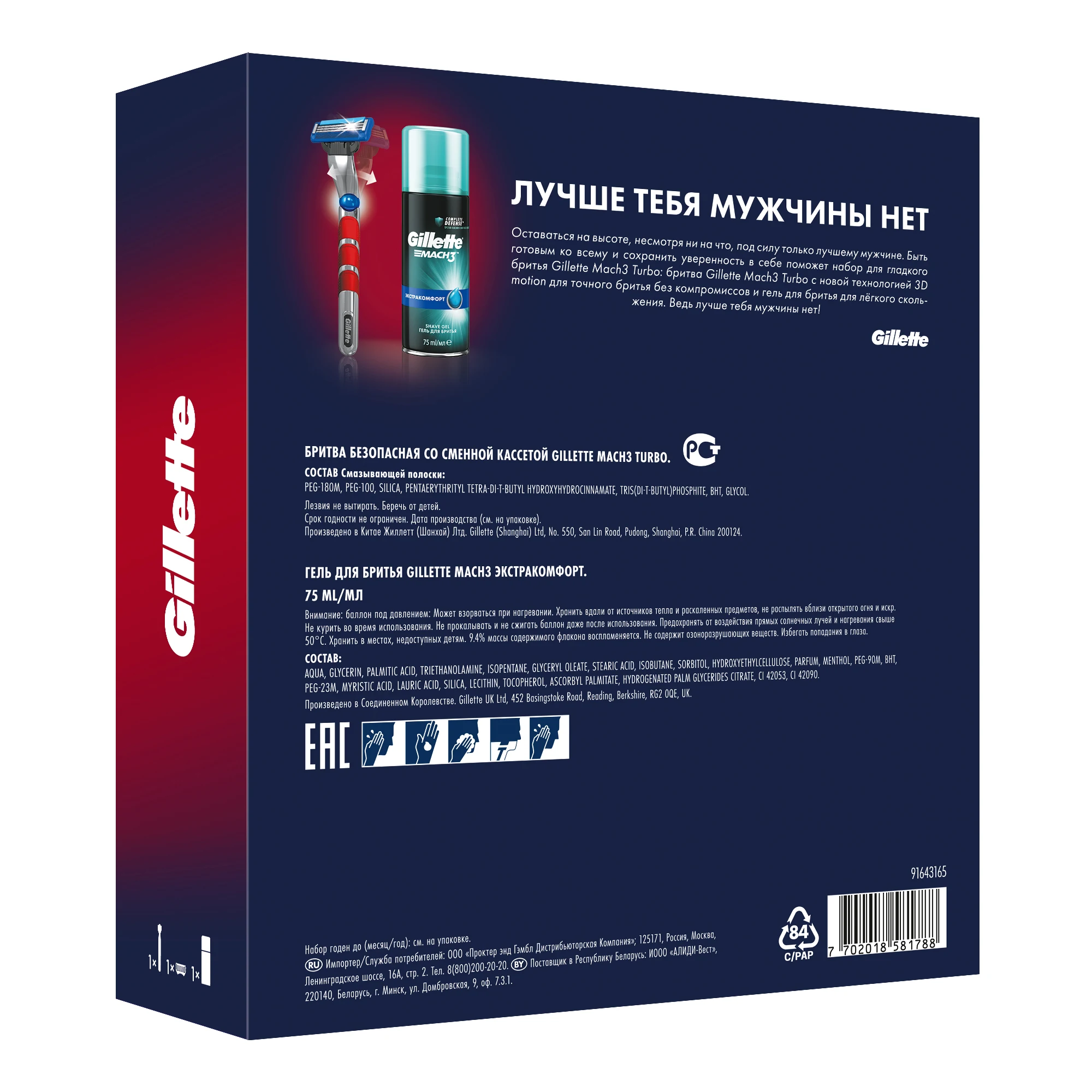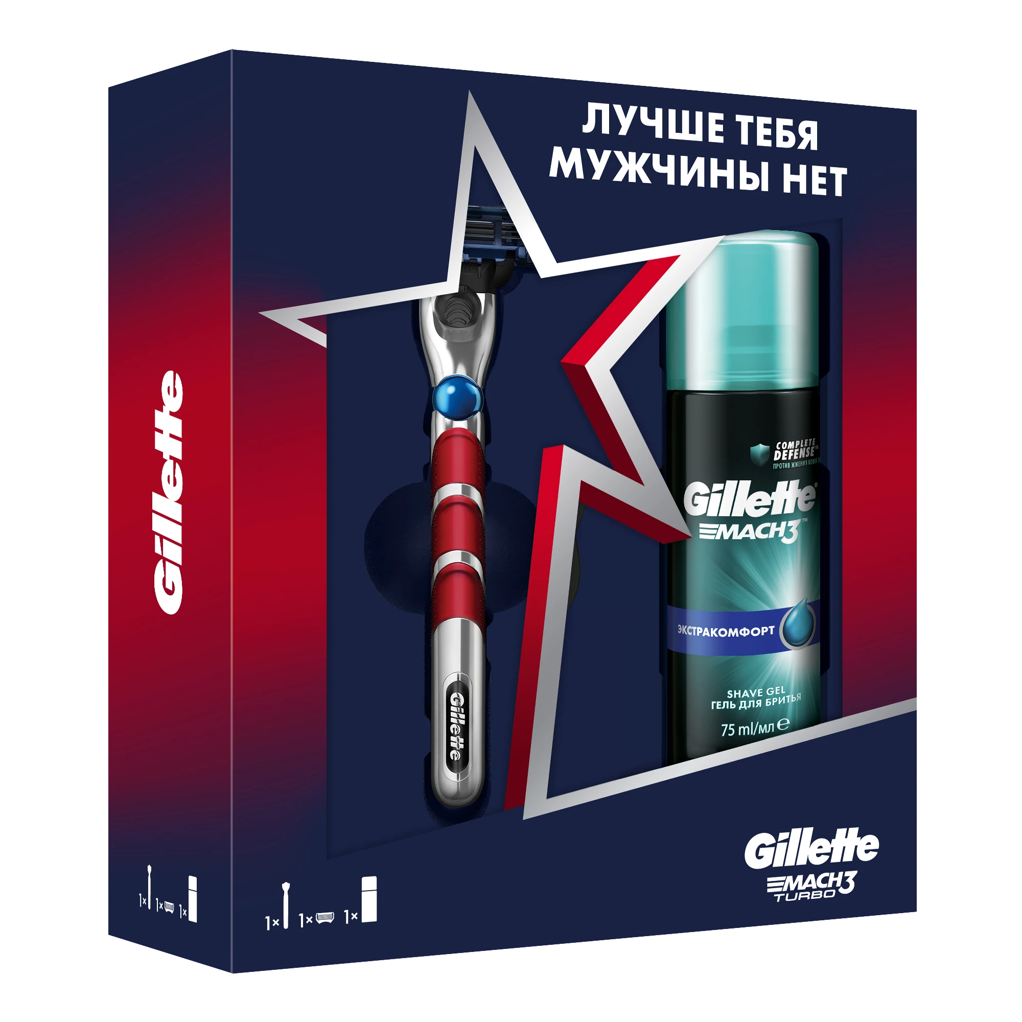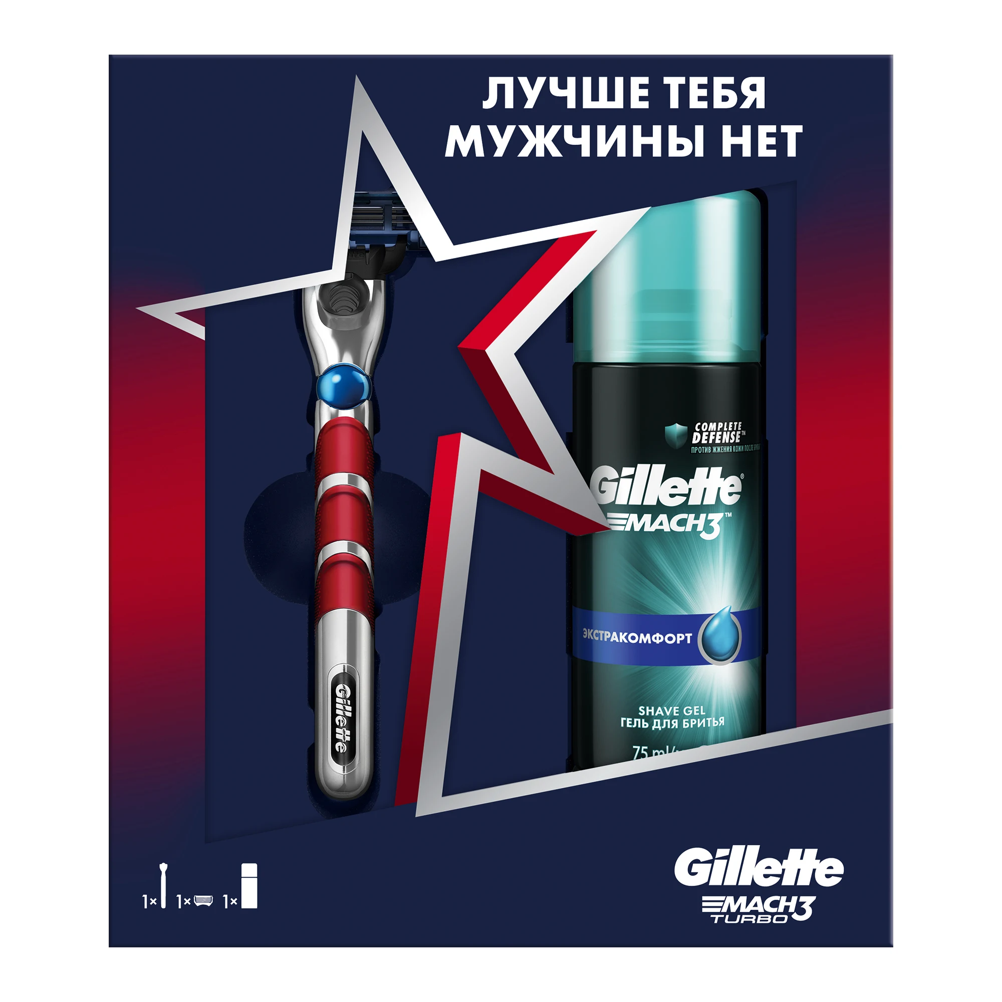 Оставаться на высоте, несмотря ни на что, под силу только лучшему мужчине. Быть готовым ко всему и сохранить уверенность в себе поможет набор для гладкого бритья Gillette Mach3 Turbo: бритва Gillette Mach3 Turbo с новой технологией 3D motion для точного бритья без компромиссов и гель для бритья Gillette Mach3 Экстракомфорт 75 мл для лёгкого скольжения. Ведь лучше тебя мужчины нет!