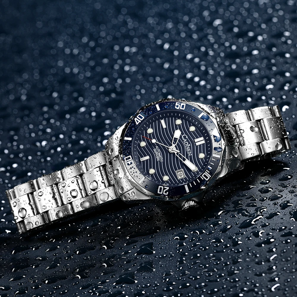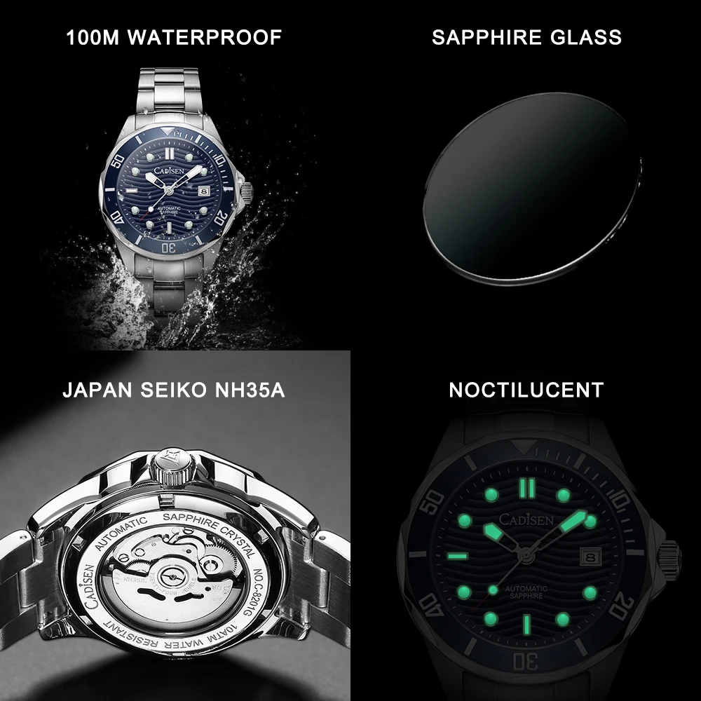 CADISEN Diver Water Ghost Роскошные сапфировые Синие Мужские автоматические механические часы с керамическим ободком 10 бар светящееся окошко для даты