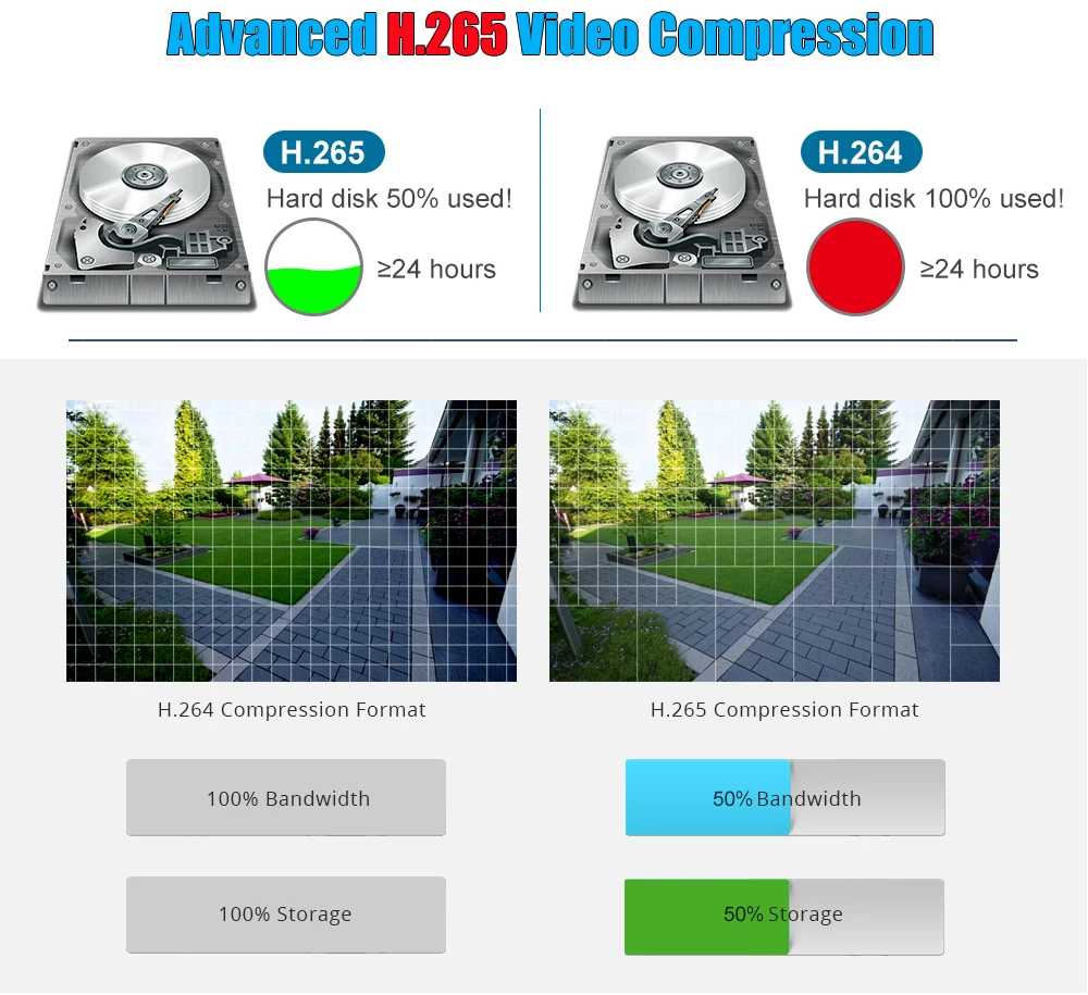 H.265 более четкое, HD разрешение предлагает вам лучшее качество изображения более низкую скорость.