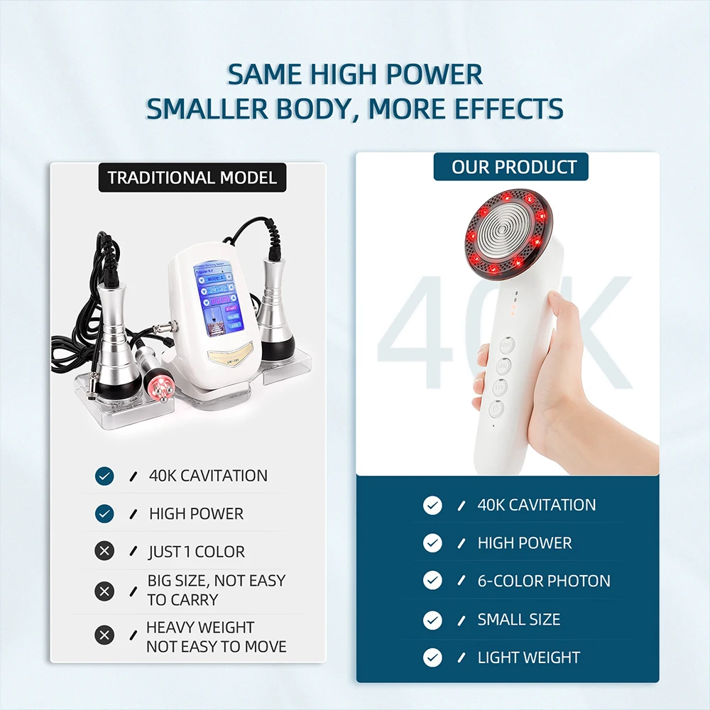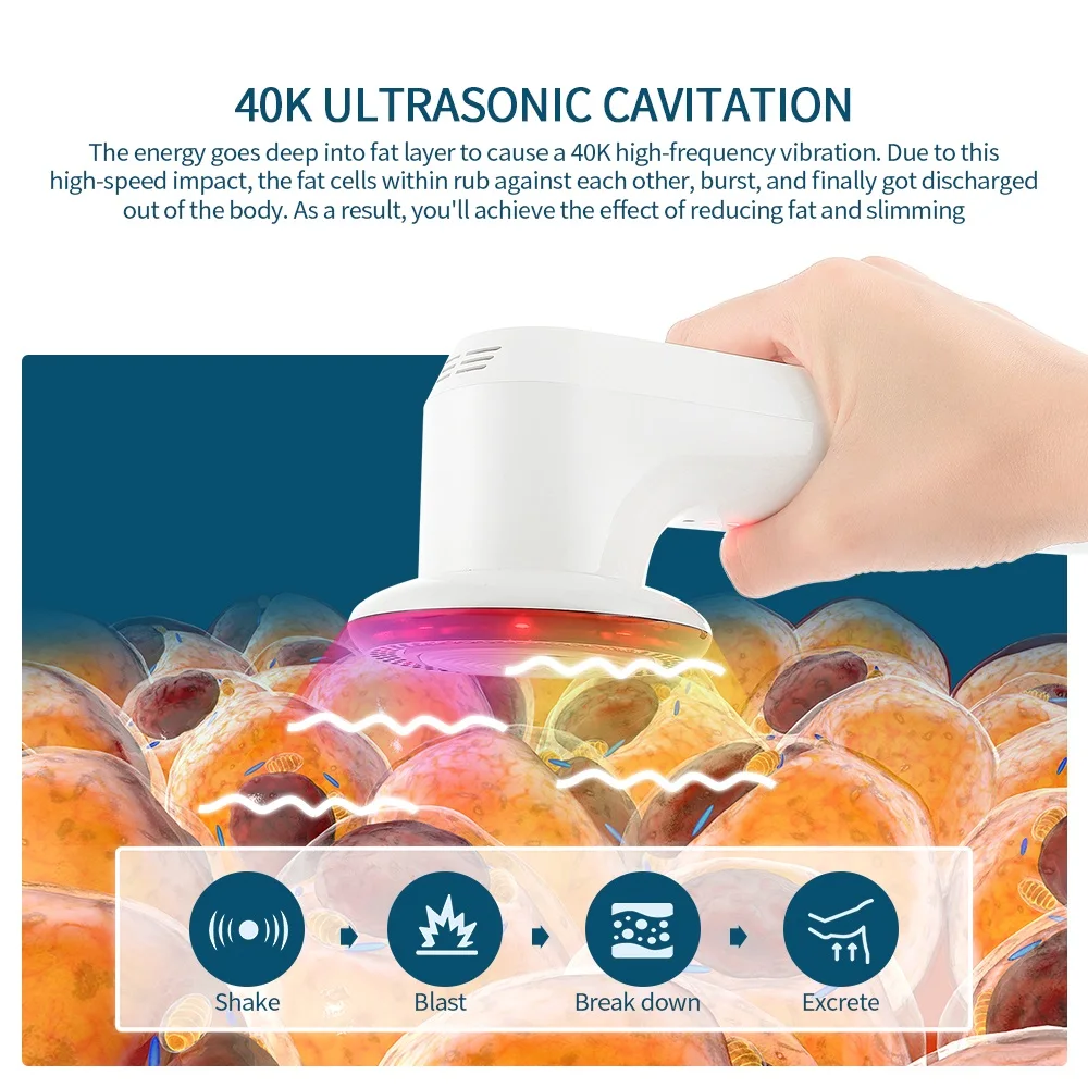 1,40 K ультразвуковая кавитация. С помощью высокочастотной вибрации глубоко в коже, он производит и взрывает бесчисленные пузырьки среди жировых клеток, эффективно встряхивать, разложить, и, наконец, удалить излишки жира.