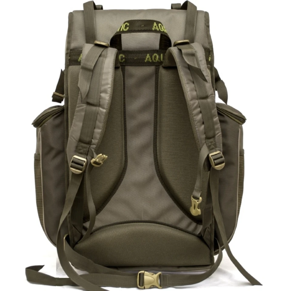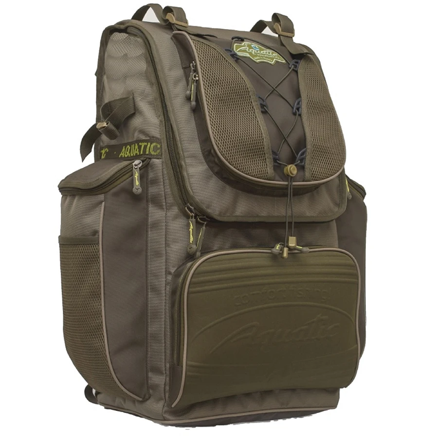 Рюкзак Aquatic объемом 65 литров изготавливается из непромокаемых нейлоновых материалов. Рюкзак имеет большой удобный вход в основное отделение, а также 4 объемных кармана с возможность закрепления дополнительных вещей снаружи. Усиленная пластиком спинка имеет мягкую основу для комфортного ношения тяжелых и твердых предметов. Подвеска рюкзака с грудной и поясной регулировкой.